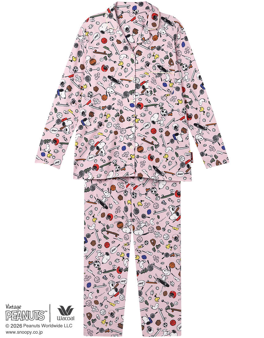 1950年に新聞コミックとしてスタートした「PEANUTS」とワコールがコラボレーション。世界中で愛されるスヌーピーや個性豊かな仲間たちのデザインでおうち時間を楽しんで。・本体に、綿100%のスムース素材を使用・スヌーピーが楽しくスポーツをしているプリント・パイピングのカラーもアクセントに【サイズ詳細】ロング袖・ロング丈パンツM:身幅52.0cm 着丈67.0cm 身丈69.5cm 肩幅40.0cm 袖丈55.0cm ボトム脇丈95.0cm 裾まわり39.0cm ウエスト58.0cm 股下(レングス)67.5cm ヒップ100.0cm L:身幅56.0cm 着丈67.0cm 身丈69.5cm 肩幅41.5cm 袖丈55.0cm ボトム脇丈95.5cm 裾まわり41.0cm ウエスト63.0cm 股下(レングス)67.0cm ヒップ104.0cm※出来上がり寸法を表示しております※サイズ詳細の寸法には多少の差異がございます 出来上がり寸法の測り方についてはこちら※アイテムによって柄の出方が異なりますのでご了承ください。