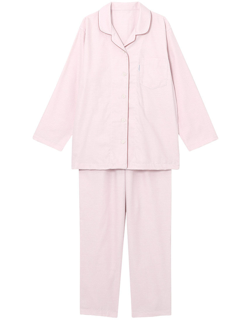 【パジャマ(ロング袖ロング丈パンツ)】・本体に、表側に起毛加工をほどこした綿100%のあたたかなスムース素材を使用・どこか懐かしく高級感が漂う、エレガントなプリント【サイズ詳細】M:身幅59.0cm 着丈65.0cm 身丈67.5cm 肩幅52.0cm 袖丈49.0cm ボトム脇丈95.0cm 裾まわり39.0cm ウエスト58.0cm ヒップ100.5cm 股下(レングス)67.5cm L:身幅63.0cm 着丈65.0cm 身丈68.0cm 肩幅53.5cm 袖丈49.0cm ボトム脇丈95.5cm 裾まわり41.0cm ウエスト63.0cm ヒップ104.5cm 股下(レングス)67.0cm LL:身幅67.0cm 着丈66.0cm 身丈69.0cm 肩幅55.0cm 袖丈49.0cm ボトム脇丈96.0cm 裾まわり44.0cm ウエスト68.0cm ヒップ109.0cm 股下(レングス)67.0cm※出来上がり寸法を表示しております※サイズ詳細の寸法には多少の差異がございます出来上がり寸法の測り方についてはこちら※アイテムによって柄の出方が異なりますのでご了承ください。表面フラッシュにご注意ください台所等で火を扱う場合には、表面の毛羽に引火することがありますので、十分にご注意ください。また、裏返して着用しないでください。「表面フラッシュとは」生地の表面毛羽に着火した火が、毛羽から毛羽へ、非常に早いスピードで、瞬時に火が走る現象です。パイル・タオル地や表面を起毛した素材で起こりやすく、綿やレーヨンなど植物せんい使用の素材にも、注意が必要です。これにより、火傷や火事になることも考えられます。炊事や暖房機具等の火には、十分ご注意ください。【綿100%】パジャマ・ルームウェアはこちらを、【綿混】パジャマ・ルームウェアはこちらをチェック!