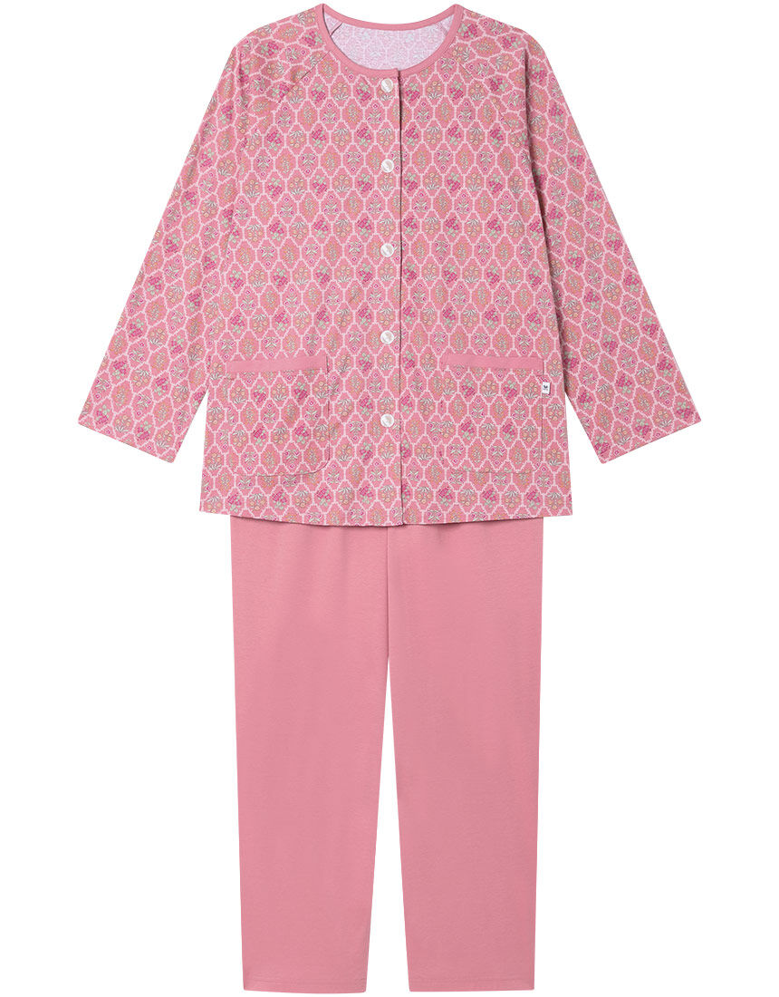 「ワコール人間科学研究開発センター」の女性の体型データをもとにしたグランダー独自のサイズ設計は、ゆったり快適な着ごこち。グランダーならではの便利でやさしい工夫をほどこした親切設計のパジャマです。・本体に、生地表面の毛羽を取る特殊な加工をほどこした、綿100%のスムース素材を使用・繊細なタッチで描いた小紋調の小花プリント・腕が上げやすく、動かしやすいラグランスリーブ・無地のボトムで、くつろぎ時間のルームウェアにもおすすめ・袖口、ボトム裾口=ゴム通し口有り【サイズ詳細】ロング袖・ロング丈パンツSP:身幅51.0cm 着丈64.5cm 身丈67.5cm 裄丈72.0cm ボトム脇丈90.0cm 裾まわり36.5cm ウエスト55.0cm 股下(レングス)62.0cm ヒップ101.5cm MP:身幅55.0cm 着丈64.5cm 身丈67.5cm 裄丈73.0cm ボトム脇丈90.5cm 裾まわり38.0cm ウエスト60.0cm 股下(レングス)62.0cm ヒップ106.5cm LP:身幅59.0cm 着丈64.5cm 身丈68.0cm 裄丈74.0cm ボトム脇丈91.5cm 裾まわり39.5cm ウエスト65.0cm 股下(レングス)62.0cm ヒップ111.5cm M:身幅55.0cm 着丈69.5cm 身丈73.0cm 裄丈75.0cm ボトム脇丈95.5cm 裾まわり38.0cm ウエスト60.0cm 股下(レングス)65.5cm ヒップ109.5cm L:身幅59.0cm 着丈69.5cm 身丈73.0cm 裄丈76.0cm ボトム脇丈96.5cm 裾まわり39.5cm ウエスト65.0cm 股下(レングス)65.5cm ヒップ114.5cm LL:身幅63.0cm 着丈70.5cm 身丈74.0cm 裄丈77.5cm ボトム脇丈96.5cm 裾まわり41.5cm ウエスト70.0cm 股下(レングス)65.5cm ヒップ119.5cm3L:身幅67.0cm 着丈71.5cm 身丈75.5cm 裄丈78.5cm ボトム脇丈96.5cm 裾まわり44.5cm ウエスト75.0cm 股下(レングス)65.0cm ヒップ126.5cm※出来上がり寸法を表示しております※サイズ詳細の寸法には多少の差異がございます 出来上がり寸法の測り方についてはこちら※アイテムによって柄の出方が異なりますのでご了承ください。