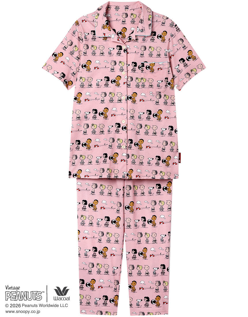 1950年に新聞コミックとしてスタートした「PEANUTS」とワコールがコラボレーション。世界中で愛されるスヌーピーや個性豊かな仲間たちのデザインでおうち時間を楽しんで。・本体に、暑い季節にここちよいシャリ感のある強撚糸を用いた綿100%の天竺素材を使用・スヌーピーと仲間たちが海で夏を楽しむ様子をプリント・パイピングのカラーもアクセントに【サイズ詳細】5分袖・8分丈パンツM:身幅53.0cm 着丈67.0cm 身丈69.5cm 肩幅42.0cm 袖丈20.0cm ボトム脇丈86.0cm 裾まわり42.0cm ウエスト58.0cm 股下(レングス)57.0cm ヒップ103.0cm L:身幅57.0cm 着丈67.0cm 身丈69.5cm 肩幅44.0cm 袖丈20.0cm ボトム脇丈86.5cm 裾まわり44.0cm ウエスト63.0cm 股下(レングス)56.5cm ヒップ107.0cm※出来上がり寸法を表示しております※サイズ詳細の寸法には多少の差異がございます 出来上がり寸法の測り方についてはこちら※アイテムによって柄の出方が異なりますのでご了承ください。