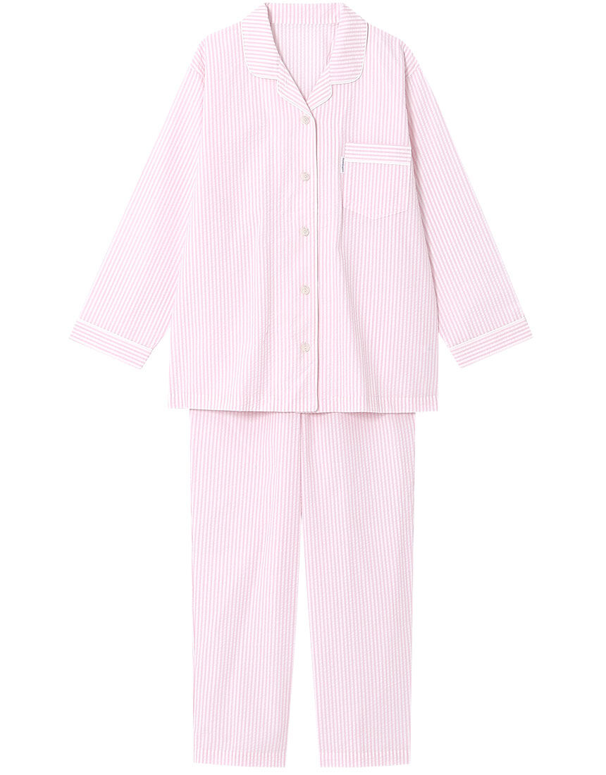 【パジャマ(ロング袖ロング丈パンツ)】"眠る時間を、夢の時間に"睡眠が豊かになれば、毎日の暮らしはもっと活力に満ちたものになる。"眠る時間を、夢の時間に"をコンセプトに、パジャマをはじめ睡眠アイテムを幅広くそろえ、喜びあふれる明日へと導きます。・縦糸を調節して、表面に波状のシボ(シワ模様)をつけた綿100%のサッカー素材を使用・肌ばなれがよく、さらっとした風合い・肩にゆとりをもたせて、腕まわりを動きやすく・ウエストゴムを2本使っているので、おなかまわりをしめつけにくい【サイズ詳細】S:身幅49.0cm 着丈68.0cm 身丈70.5cm 肩幅45.0cm 袖丈51.5cm ボトム脇丈95.0cm 裾まわり38.0cm ウエスト55.0cm ヒップ101.5cm 股下(レングス)67.5cm M:身幅53.0cm 着丈68.0cm 身丈71.0cm 肩幅46.0cm 袖丈52.0cm ボトム脇丈95.0cm 裾まわり40.0cm ウエスト60.0cm ヒップ105.0cm 股下(レングス)67.0cm L:身幅57.0cm 着丈68.0cm 身丈71.0cm 肩幅47.5cm 袖丈52.0cm ボトム脇丈95.5cm 裾まわり42.0cm ウエスト65.0cm ヒップ109.0cm 股下(レングス)66.5cm※出来上がり寸法を表示しております※サイズ詳細の寸法には多少の差異がございます出来上がり寸法の測り方についてはこちら※メンズパジャマもございます。メンズパジャマはこちら【綿100%】パジャマ・ルームウェアはこちらを、【綿混】パジャマ・ルームウェアはこちらをチェック!