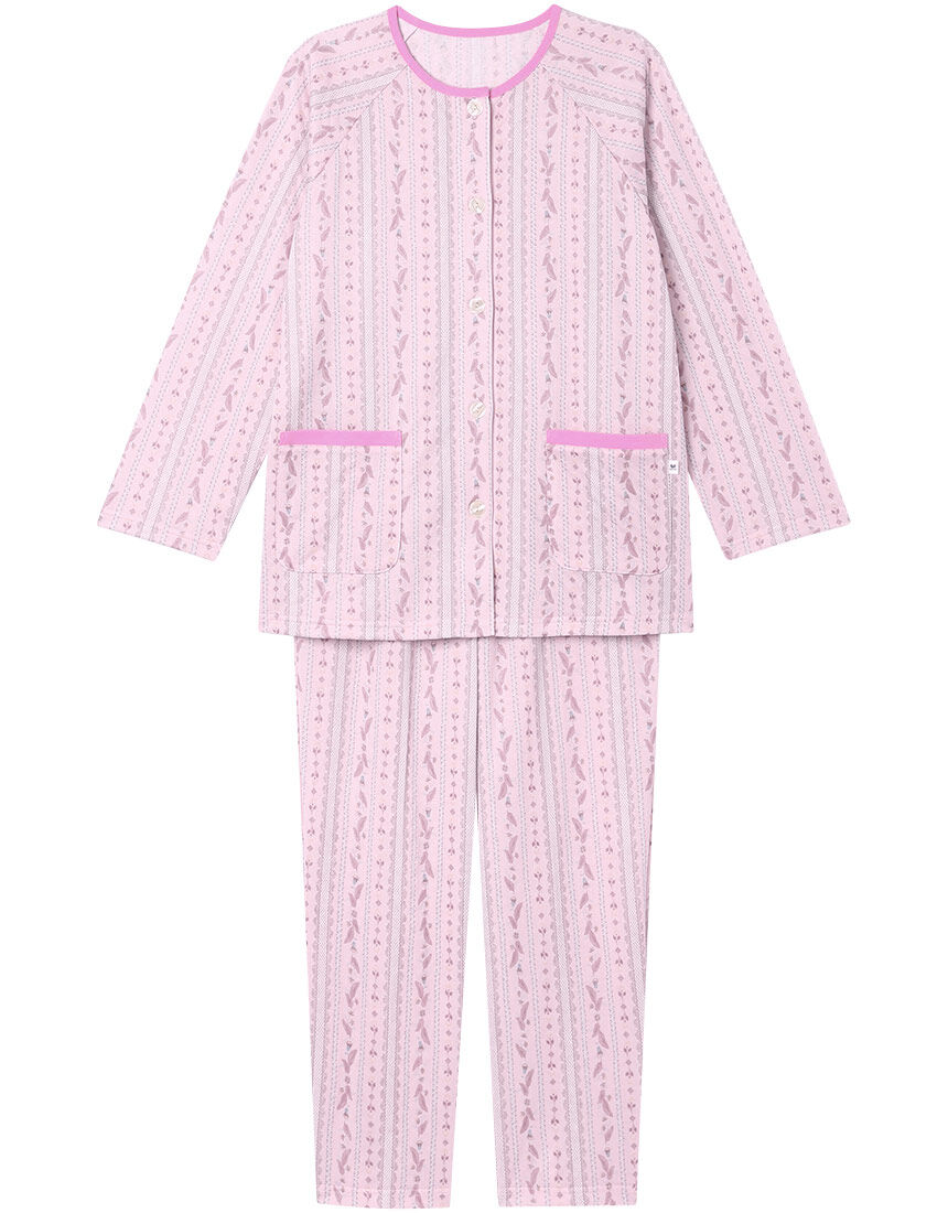 【パジャマ(ロング袖ロングパンツ)】グランダー独自のサイズ設計は、ゆったり快適な着ごこち。1.背・脇に縫い付けネームがなく、やさしい肌あたり2.留めはずしラクラク大きめボタン3.やわらかなゴムでウエストがラク4.深めの前合わせですきまから胸もとが見えにくい5.ズボンの前後がわかりやすい目印付き6.くいこみにくく動きやすいマチ付き7.裾口、袖口、ウエストにゴム替え口・本体に、綿100%のガーゼを3枚重ねた、通気性がよく、ふんわりここちよい肌ざわりの素材を使用・白を基調とした、小さなブーケとリボンの愛らしいプリント柄・腕が上げやすく、動かしやすいラグランスリーブ・袖口はゴム入り【サイズ詳細】SP:身幅51.0cm 着丈64.5cm 身丈68.0cm 裄丈72.0cm ボトム脇丈90.0cm 裾まわり38.0cm ウエスト55.0cm 股下(レングス)62.0cm ヒップ104.0cm MP:身幅55.0cm 着丈64.5cm 身丈68.0cm 裄丈73.0cm ボトム脇丈90.5cm 裾まわり39.5cm ウエスト60.0cm 股下(レングス)62.0cm ヒップ109.0cm LP:身幅59.0cm 着丈64.5cm 身丈68.5cm 裄丈74.0cm ボトム脇丈91.5cm 裾まわり41.0cm ウエスト65.0cm 股下(レングス)62.0cm ヒップ114.0cm M:身幅55.0cm 着丈69.5cm 身丈73.0cm 裄丈75.0cm ボトム脇丈95.5cm 裾まわり39.5cm ウエスト60.0cm 股下(レングス)65.5cm ヒップ112.0cm L:身幅59.0cm 着丈69.5cm 身丈73.5cm 裄丈76.0cm ボトム脇丈96.5cm 裾まわり41.0cm ウエスト65.0cm 股下(レングス)65.5cm ヒップ117.0cm LL:身幅63.0cm 着丈70.5cm 身丈74.5cm 裄丈77.5cm ボトム脇丈96.5cm 裾まわり43.0cm ウエスト70.0cm 股下(レングス)65.5cm ヒップ122.0cm3L:身幅67.0cm 着丈71.5cm 身丈76.0cm 裄丈78.5cm ボトム脇丈96.5cm 裾まわり46.0cm ウエスト75.0cm 股下(レングス)65.5cm ヒップ130.0cm※出来上がり寸法を表示しております※サイズ詳細の寸法には多少の差異がございます出来上がり寸法の測り方についてはこちら※アイテムによって柄の出方が異なりますのでご了承ください。【綿100%】パジャマ・ルームウェアはこちらをチェック!