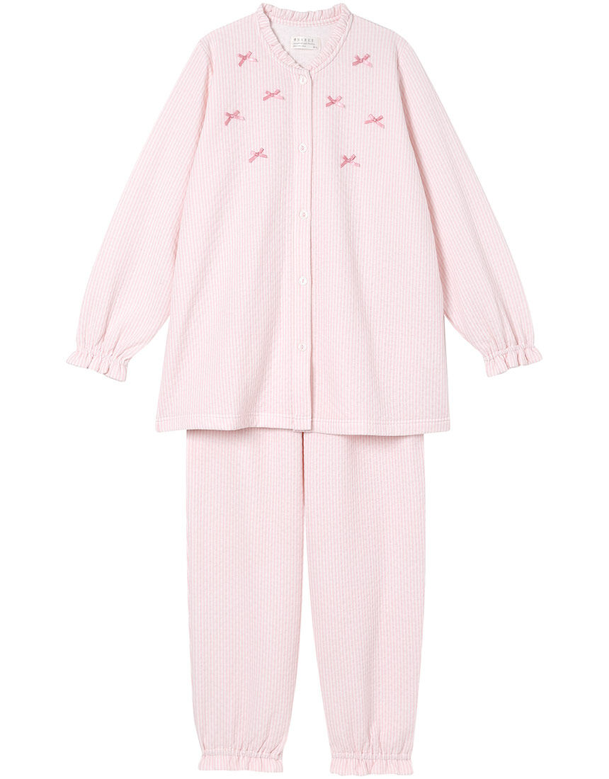 DailyをプチHappyに!ランジェノエルはワコール発の下着セレクトショップ。生地は「綿(わた)入りの接結」2枚の生地を合せて1枚の生地にし、生地間に中綿を入れた暖かい素材。中綿を入れることで厚みと保温性も増します。優しいカラー展開の「ストライプ柄」さりげないフリル襟が上品。トップスの胸元にリボンを散りばめました。袖口、足口は軽く絞ってフリル仕様。シンプルな柄にフェミニンな形が大人可愛い一着です。M-L:バスト112.5cm 着丈70cm 肩幅37cm 裄丈76cm ボトム丈96cm 股下65.5cm ウエスト62cm上がり 足口30cm上がり◆製造メーカー:ナルエー