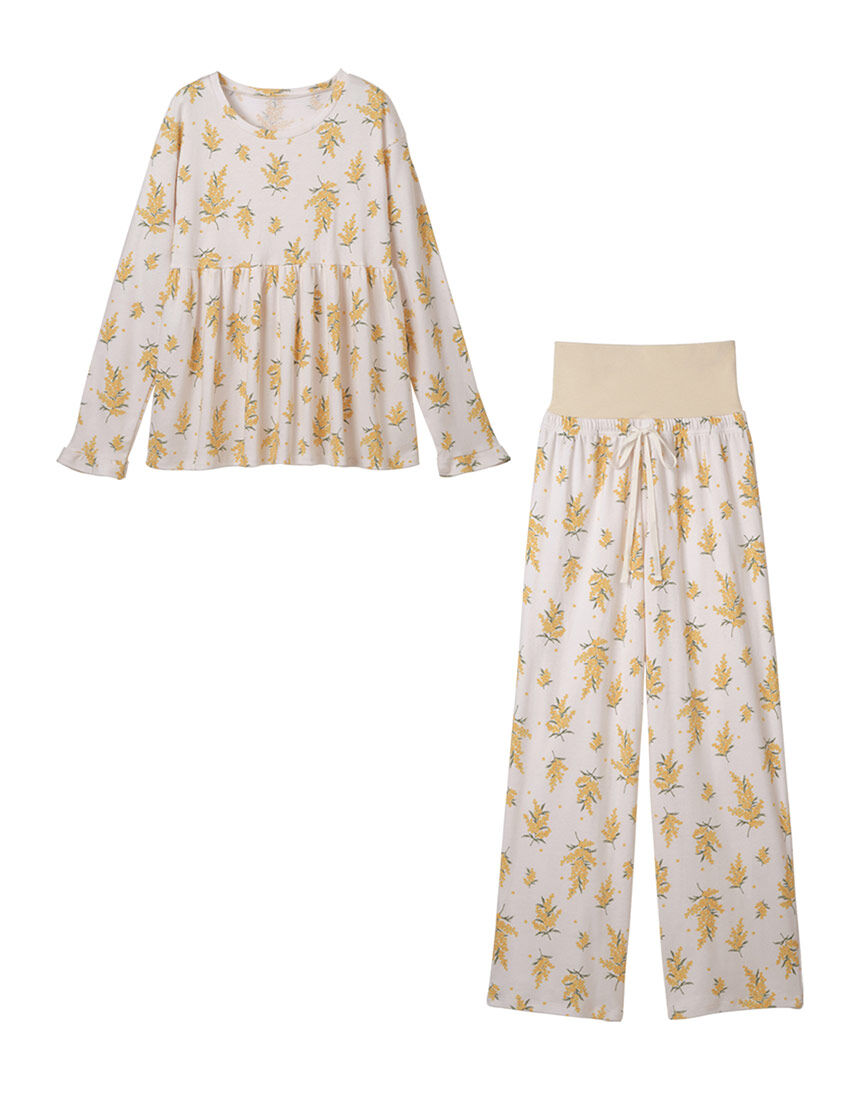 【おすすめポイント】・遊び心ある色柄と肌ざわりの良い素材、お手頃プライスが好評のパジャマシリーズ。・腹巻き付きでやさしくおなかを守り、冷え対策にもぴったり。・アンダーバストから広がるペプラムデザインで、おなか周りを可愛らしくカバー。【こんな人、こんな時に】・お手頃価格で大人可愛いパジャマをお探しの方に・温活に気を遣っている方に・肌ざわりや着心地を重視する方に・ギフトとしてもおすすめ【デザイン】・トップスは前後とも胸下のラインで切り替えてギャザーを寄せ、裾に向かって広がるペプラムデザイン。おなか周りをふんわりカバー。・袖口は、共生地のフリルをあしらってスウィートに。・ヒップが隠れるくらいの長め丈。・ボトムスはストレッチ生地二つ折りの腹巻き付き。みぞおちくらいまでの深さで、おなかにぴったりフィット。・ウエストの切り替えラインに一周平ゴム&ひも入りで調節可。・ボトムスは全体にほど良くゆとりがあるワイドストレートシルエット。くるぶしが隠れるくらいの丈。【素材】・トップス、ボトムスともにやや厚みがあり、柔らかな肌ざわりのコットン混生地。・腹巻き部はコットン混ストレッチ生地二つ折り。伸縮性が高く、ぴったりとフィット。[アイボリー]アイボリー地にイエロー&グリーンでミモザの咲く小枝をプリントし、明るく優しげ。[アッシュピンク]くすんだピンク地に濃いピンク&グリーンでチューリップをプリントし、大人の可愛らしさ。