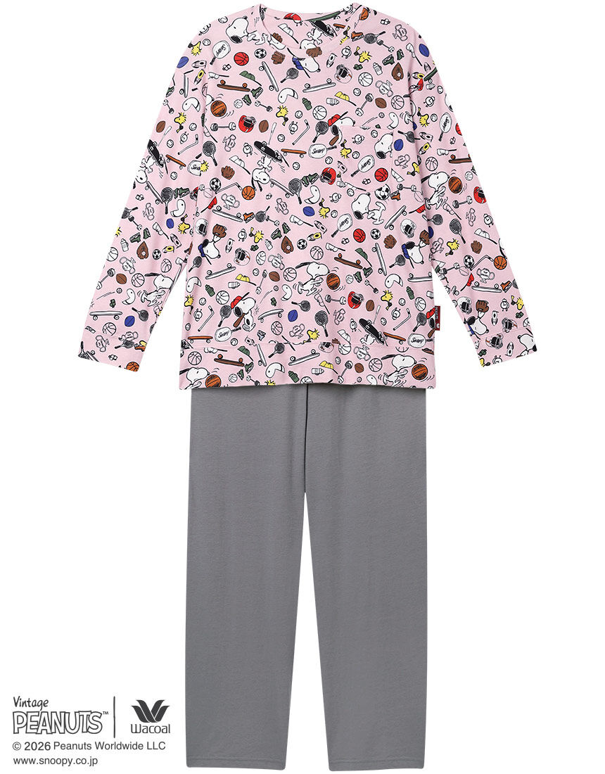1950年に新聞コミックとしてスタートした「PEANUTS」とワコールがコラボレーション。世界中で愛されるスヌーピーや個性豊かな仲間たちのデザインでおうち時間を楽しんで。・トップス本体に、綿100%のスムース素材を使用・ボトム本体に、暑い季節にここちよいシャリ感のある強撚糸を用いた綿100%の天竺素材を使用・トップスはスヌーピーが楽しくスポーツをしているプリント・トップスのプリントを引き立てる無地のボトム【サイズ詳細】ロング袖・ロング丈パンツM:身幅53.0cm 着丈62.5cm 身丈65.5cm 肩幅47.0cm 袖丈51.5cm ボトム脇丈95.0cm 裾まわり50.0cm ウエスト58.0cm 股下(レングス)67.5cm ヒップ99.0cm L:身幅57.0cm 着丈62.5cm 身丈65.5cm 肩幅48.5cm 袖丈51.5cm ボトム脇丈95.5cm 裾まわり52.0cm ウエスト63.0cm 股下(レングス)67.0cm ヒップ103.0cm LL:身幅61.0cm 着丈63.5cm 身丈66.5cm 肩幅50.0cm 袖丈52.0cm ボトム脇丈96.0cm 裾まわり55.0cm ウエスト68.0cm 股下(レングス)67.0cm ヒップ108.0cm※出来上がり寸法を表示しております※サイズ詳細の寸法には多少の差異がございます 出来上がり寸法の測り方についてはこちら※アイテムによって柄の出方が異なりますのでご了承ください。