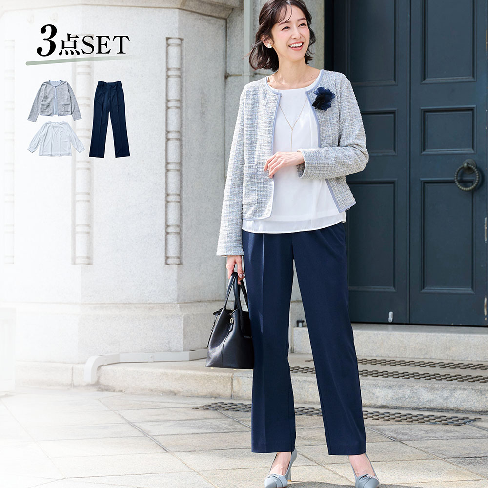 【3点セット】ジャケット/ストレートパンツ/ブラウス▼ジャケット・ほんのりラメ入りのツイード素材ジャケット・カットソーなので伸縮性もありカーディガンのようなラクな着心地・ホックは1箇所で、端のパイピング仕様がアクセントに・左右ポケットはきちんとスマホが入るサイズ感▼ストレートパンツ・センタープレスの入ったすっきりシルエットで脚長効果・ウエスト後ろゴム仕様で座った時もラク・ジャケット同様、伸縮性の高い素材なので窮屈感のないはき心地・長い期間はけるように、あえて裏地はない仕様▼ブラウス・取り外し可能なアクセサリー付きブラウス・アクセサリーはトレンドのY字デザインで今っぽい・表地は薄手のジョーゼット素材で上品に・袖口までカットソー素材の裏地付きで透けにくく、寒さ対策にも◎・手首をすっきり見せてくれる八分袖Style Note(スタイルノート)2000年のデビュー以来、長きにわたりご好評を頂いている ベルメゾンのオリジナルブランド。トレンドを適度に取り入れながら、素材・仕立て・シルエットに至るまで、大人の女性にふさわしいクオリティを追求し、お洒落が楽しくなるスタイルをお届けします。