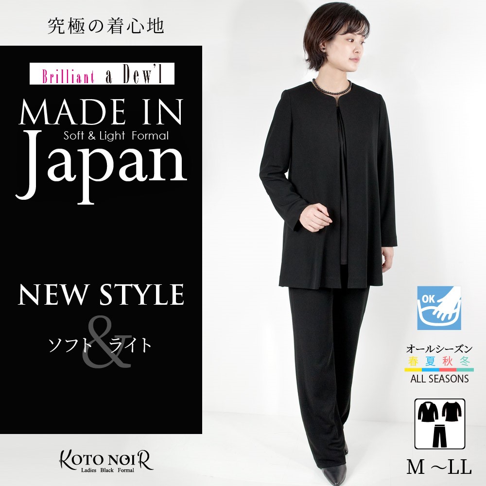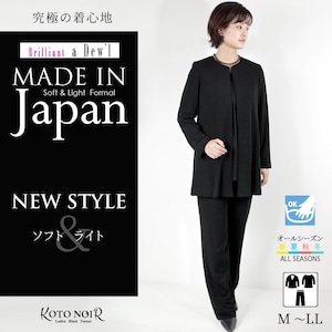 日本製の高級感漂うワンランク上のソフトなブラックフォーマルです。厳選した素材と熟練の職人が縫製した妥協のない品質をお届けいたします。■並んだときに差が付く極上の黒厳選した染料や深色剤で光の反射をコントロールする低屈折樹脂加工を施し、より濃く深い黒を表現しております。 ■高発色・高反発性ポリエステル素材「ゼログ」使用(ジャケット・パンツ)・ソフトでしなやかな肌ざわり・シワになりにくい高反撥性のある素材・上質な生地感を表現する発色性の良さ・動きやすさを追及した優れたストレッチ性・ご家庭で手洗い可能なウォッシャブル機能 ■シルクのような美しさを放つ漆黒の高級繊維「ソアロン」使用生地シルクのような艶と肌触りが魅力の高級トリアセテート繊維「ソアロン」を使用した生地です。合成繊維にはない適度な吸湿性。織物ではなくニットなのでストレッチ性があり、着やすく肌に優しいタッチ。ご家庭での手洗いが可能です。■着心地楽なシンプルジャケット 軽くてしなやかなニット素材を使用したソフトなジャケット。シンプルなノーカラージャケットは、ヒップをさりげなくカバーする着丈。フロントはホック開きですっきりとした印象に仕立てました。両脇にはポケットを備え、小物の収納にも便利です。ご家庭での手洗いが可能です。 ■プルオーバータイプのふんわりブラウス ソアロン混素材を使用し、夏場も快適な着心地。フロントに施したタックがふんわりとしたシルエットを生み、1枚でも上品に着こなせます。ご家庭での手洗いが可能です。■着心地楽なシンプルパンツ 軽くてしなやかなニット素材を使