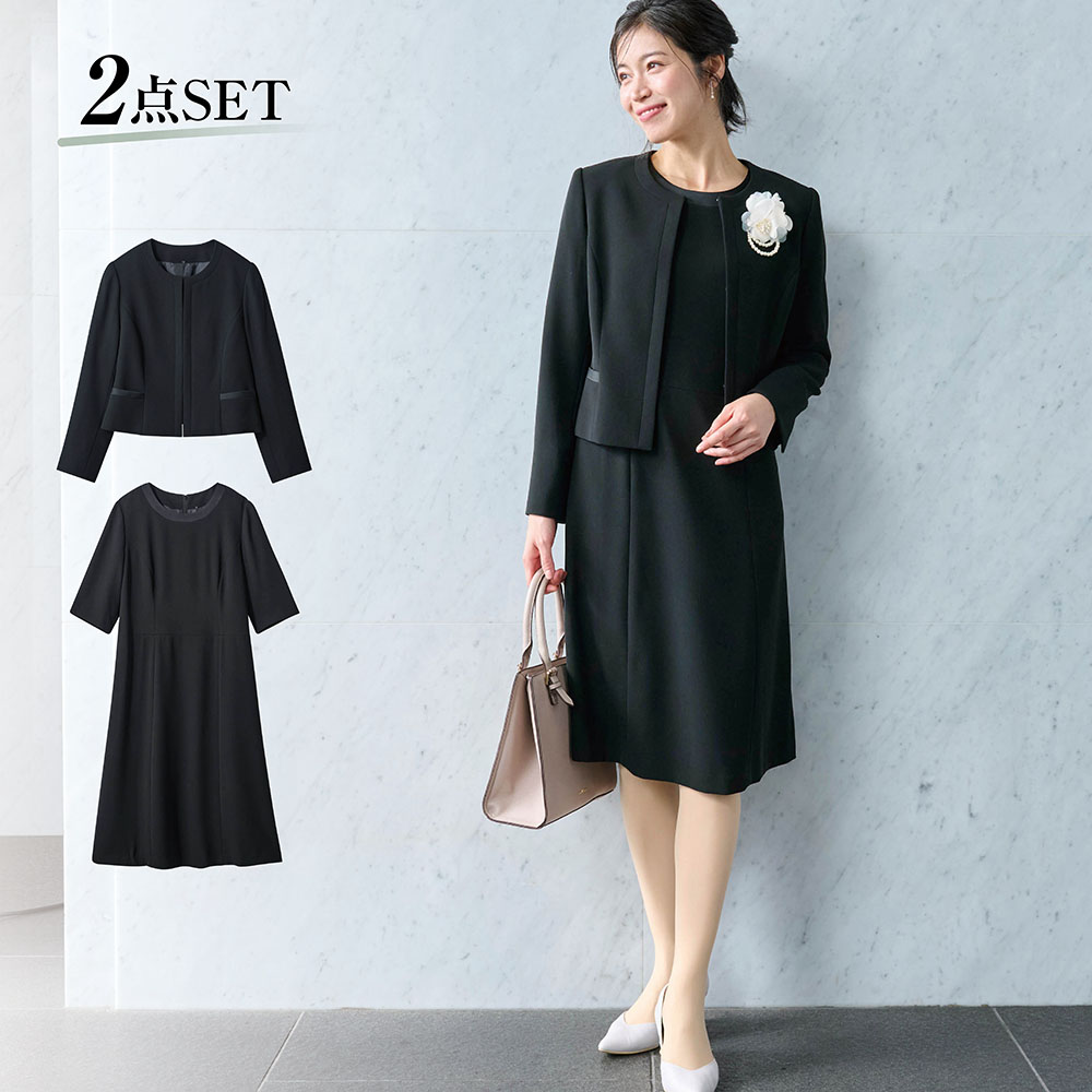 【2点セット】ノーカラージャケット/ワンピース▼ノーカラージャケット・程よく開いた首元が女性らしさを演出・肌触りの良い素材で、ハリと表面感がありリッチな印象に・袖口はスリット入りで折り返した着こなしも◎・フロントはデザインを邪魔しないホック留め▼ワンピース・シンプルかつスタンダードなシルエットで一枚でも綺麗に着られる・襟元はサテン生地で切り替えアクセントに・肘を隠せる長めの袖丈がうれしい・膝も隠れる安心の丈感いざという時に持っておきたいブラックフォーマル。シンプルでスタンダードなデザインで飽きが来ず、幅広い年齢層の方に長く愛用していただけます。#入学式#卒園式#入園式#卒業式#入学#入園#卒業#卒園#セレモニースーツ#フォーマルセット #フォーマルスーツ #通勤#礼服#式服#結婚式#受験#七五三#発表会#ママ#ワンピーススーツ
