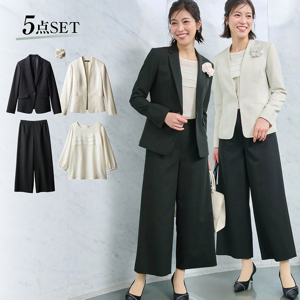 【セット内容】(1)テーラードジャケット(2)ノーカラージャケット(3)ブラウス(4)パンツ(5)コサージュ―テーラードジャケット―・パネル切替え、台襟、肩ダーツなど、着たときの美しさにとことんこだわったデザイン・襟元のVゾーンですっきりと着映え、スリット入りだから袖口を折り返してもサマになる・スマートフォンが入る内ポケット付き―ノーカラージャケット―・ラメ感の美しい優しいグレーのオリジナルツイード素材を使用・首に沿うように設計されたシャープなV開きの襟デザインが、胸もとをすっきり見せ・パネル切替えによる立体的なフォルムと、繊細なラメのきらめきが相まって着るだけで女性らしく―ブラウス―・胸元にあしらわれた3段のタックが、控えめながら適度なアクセント・袖山ギャザーで、気になる二の腕をふんわりカバー・女性らしい七分袖で、すっきりとした手もとを演出します―パンツ―・広がりすぎない上品なセミワイドシルエット・足首が見えるクロップド丈で抜け感が生まれ、重くなりすぎない・後ろウエストはゴム仕様で着脱もはき心地もラクチン―コサージュ―・2種類の白を重ねた華やかなコサージュ・花芯のないシンプルなデザインで、ソフトな付け心地