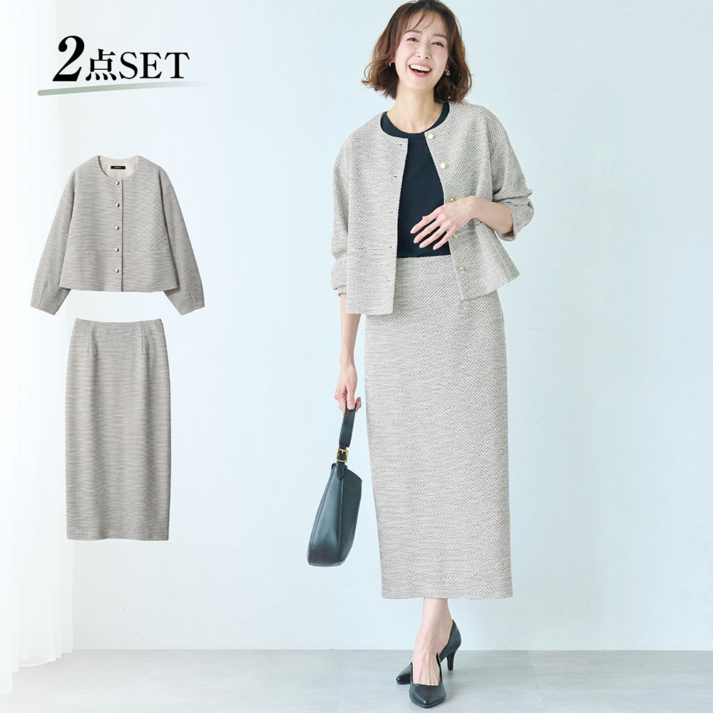 【2点セット】ジャケット/スカート▼ジャケット・ゴールド調ボタンが印象的なショート丈ジャケット・表情感がありながら、伸縮性抜群のカットツイードで上品な佇まいに・ウエスト部分に切り替えを入れることで、ウエスト位置を高く見せてすっきり・袖はすこしポワンとしたシルエットながら、袖口はダーツを取ったランタンスリーブがこなれ感を演出・ショート丈なので、単品としてワンピースやワイドパンツ、スカートとも好相性・左右ポケット付き、裏地付き▼スカート・ウエストフロントはフラットですっきり、後ろ中央ゴム仕様なので着席時も安心・長時間座っていても快適なストレッチ素材・左脇ファスナー開き、後ろ裾は大人女性にぴったりなベンツ仕様に・裏地にはニットストレッチ裏地を採用・きちんと裏地も伸びてくれる安心のはき心地