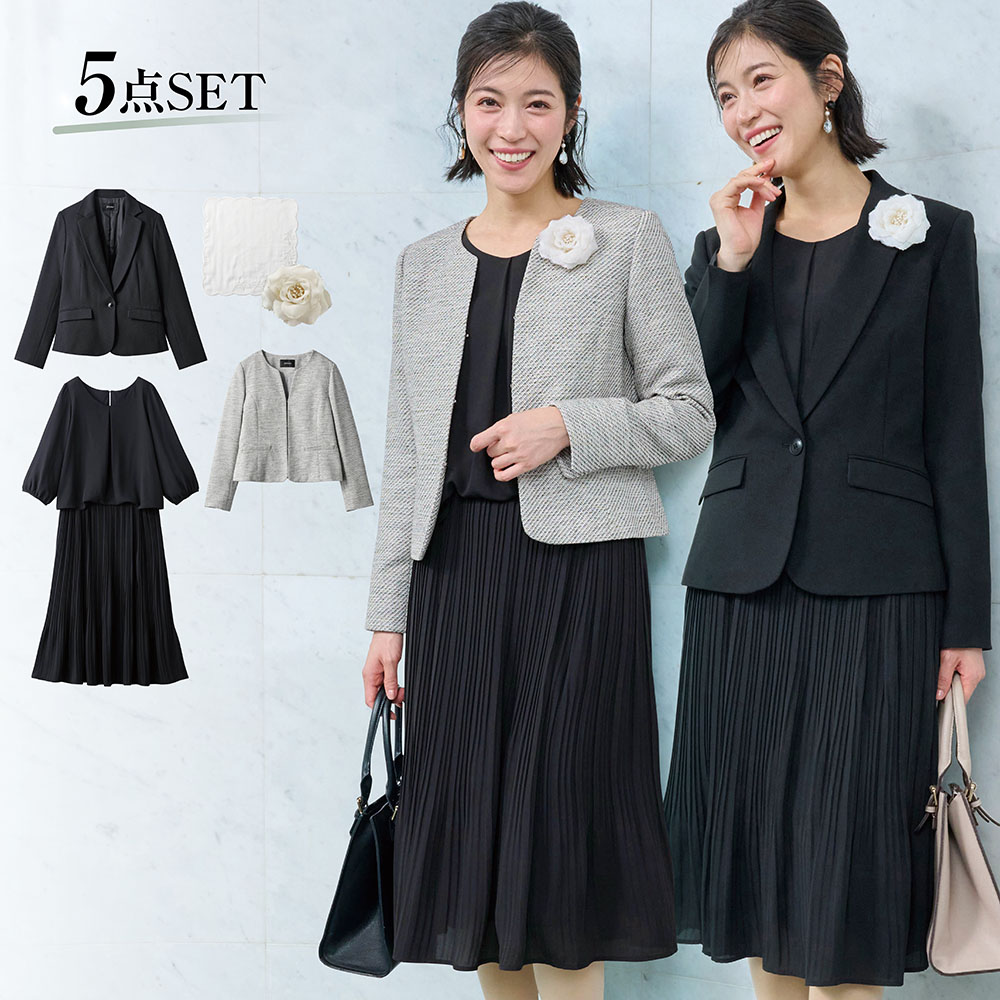【セット内容】(1)ツイードジャケット(2)ノーカラージャケット(3)ワンピース(4)コサージュ―ツイードジャケット―・落ち着いた黒を基調としたツイード素材を使用・高級感があり、入卒式や謝恩会など華やかなセレモニーの格式にマッチ―ノーカラージャケット―・すっきり見えのノーカラージャケットは慶弔問わず使える落ち着いたデザイン・後ろの裾が少しだけ広がったペプラムデザインが女性らしさを強調・ややスタンドネック気味のノーカラーVネックが端正かつきちんとした印象―ワンピース―・裾に向かってややフレアになっているシルエットが落ち着いた中に女性らしさを印象付けます・フロントのダーツで女性らしい優美なシルエットを描き、一枚でもサマになります・前開きファスナーなので脱ぎ着の際にメイクがつかず便利―コサージュ―・ツイードジャケットと同生地のコサージュ・着けるだけで装い全体がパッと華やかに