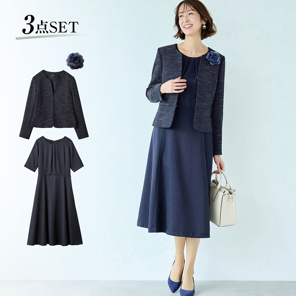 【セット内容】(1)ジャケット(2)ワンピース(3)コサージュ―ジャケット―・ネイビーベースに白っぽいスラブがところどころに見える、表面感があるツイード素材で上品さと好感度を演出・ウエスト部分のペプラム切替えで女性らしいシルエットに・開けても閉じてもきれいなフロントホック仕様―ワンピース―・体のラインをきれいに見せてくれるフィット & フレアシルエット・気になる二の腕をカバーしながら手元をすっきり見せる五分袖・スマホの入るポケット付き―コサージュ―・コーディネートに華やかさをプラスするコサージュも同系色ですっきりまとめて・ハリ感のあるオーガンジー素材やしっかりとしたボリュームで存在感を発揮