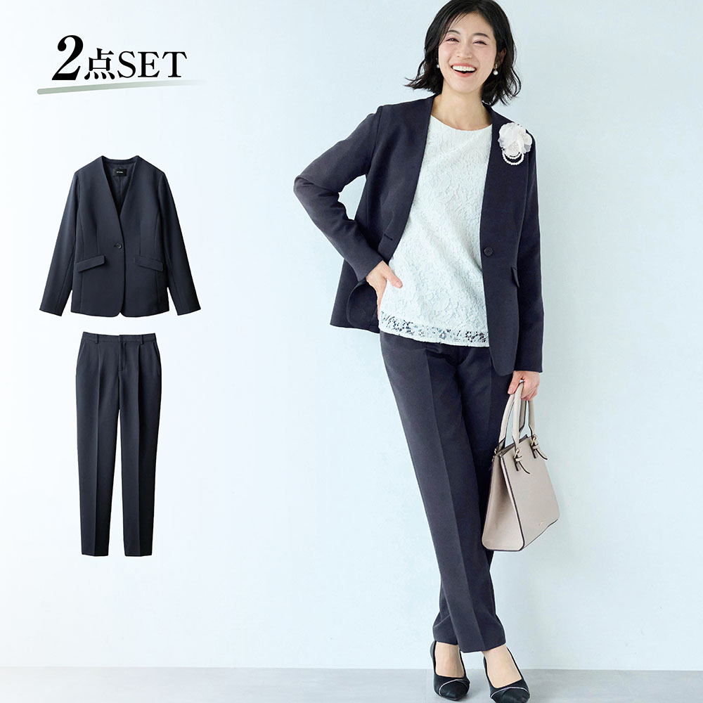 【2点セット】ノーカラージャケット/テーパードパンツ▼ノーカラージャケット・入卒以外でも着回ししやすいダ-クネイビーカラーのノーカラージャケット・フラップや切替えの視覚効果でウエストをすっきり見せ・やや長めにした着丈で今っぽい縦長シルエットに・袖口スリットで手首を出してすっきり・使い勝手の良い総裏地付き・ポケットはスマホがすっぽり入る大きさで式典中の出し入れにも便利・素材はほどよいふくらみ感があり、伸縮性に優れたダブルクロス素材▼テーパードパンツ・裾に向けて細くなるすっきりとしたテーパードシルエット・ウエストは後ろはゴム・ワンタック仕様でお腹まわりやヒップにゆとりを作り、着席時にラクちん・脚長効果のあるセンタープレスできちんと感も◎・膝下まで裏地付きで、足入れしやすいのもうれしい・ジャケットと同素材のラクなはき心地
