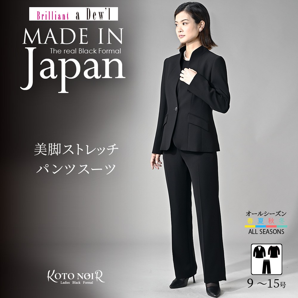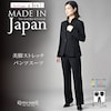 日本製の高級感漂うワンランク上のブラックフォーマルです。厳選した素材と熟練の職人が縫製した妥協のない品質をお届けいたします。■並んだときに差が付く極上の黒厳選した染料や深色剤で光の反射をコントロールする低屈折樹脂加工を施し、より濃く深い黒を表現しております。■「2WAYストレッチ」でシワになりにくく、適度な反発性もある、仕立て映えする素材を使用しています(ジャケット・パンツ)。ブラウスはストレッチ性に優れた柔らかい肌ざわりのシフォンを使用しています。■首まわりを美しく見せるスタンドカラージャケット後衿はスタンドカラー仕様で、首元をさりげなくカバー。すっきりとしたカッティングが印象的なノーカラージャケットです。ヒップラインを覆う、やや長めの着丈で安心感のあるシルエット。袖口にはスリットを入れ、折り返して長さの調整も可能です。■2WAYの着こなしができるブラウス薄手素材を2枚重ねにした、軽やかな仕立て。内側の裾をウエストインしても着用できる、2WAYデザインです。衿ぐりと袖口にタックを施し、全体をふんわりとやさしい印象に仕上げました。お手持ちのアイテムとも合わせやすく、着回し力の高い一着です。 ■脚をすっきり長くみせるパンツ後ろウエストはゴム仕様で、楽な履き心地。ウエストサイズの多少の変化にも対応します。センタープレスを施し、脚をすっきり長く見せる美脚シルエットに仕上げました。
