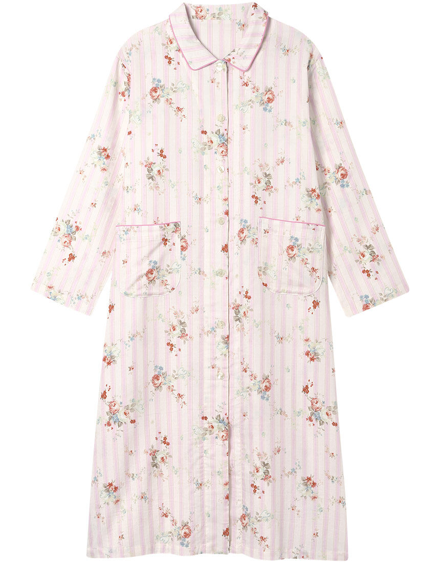 ・本体に、綿100%の二重ガーゼ素材を使用・通気性がよくさらっと快適・吸汗速乾性があり汗をかいても乾きやすい・ふんわりやさしい肌ざわり・ナチュラルなイメージのストライプ柄と動きのあるローズモチーフの組み合わせが新鮮・すっきりとした印象の襟付きデザイン【サイズ詳細】ロング袖M:身幅53.0cm 着丈110.0cm 身丈112.5cm 肩幅46.0cm 袖丈52.0cm L:身幅57.0cm 着丈110.0cm 身丈112.5cm 肩幅47.5cm 袖丈52.0cm LL:身幅61.0cm 着丈111.0cm 身丈114.0cm 肩幅49.0cm 袖丈52.5cm※出来上がり寸法を表示しております※サイズ詳細の寸法には多少の差異がございます出来上がり寸法の測り方についてはこちら※アイテムによって柄の出方が異なりますのでご了承ください。