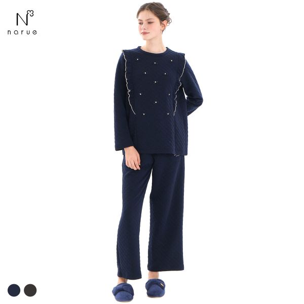 ■ナルエー パジャマ 裏綿接結(綿入り)ハートジャガードフリルパジャマ セットアップ 上下セット ルームウェア 長袖 Narue