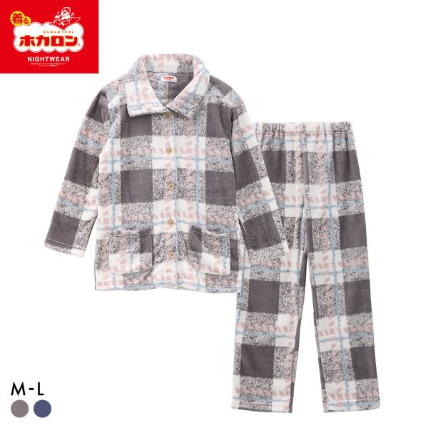■着るホカロン レディース ルームウェア パジャマ ミンクフリース チェック柄 肩キルト 衿2WAY 長袖 上下セット M L