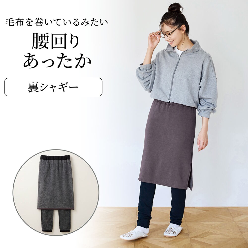 ―デザイン・スタイリング―・スカート×レギンスの重ね着風デザイン・スカートはサイドスリット入りで足さばきも快適 ・右後ろに便利なポケット付き―素材―・足を入れた瞬間からあたたかい 毛足長めの裏シャギー素材#スカッツ