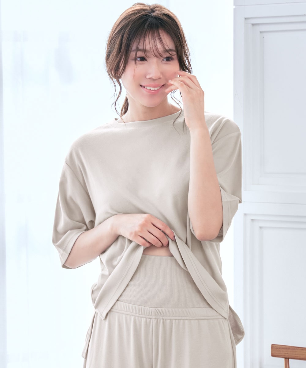 全色再入荷! SNSでも大人気の腹巻付きルームウェアシリーズから、通販限定で夏向けの新素材バージョンが登場!汗ばむ季節でもさらっと快適に過ごせるよう、「吸水速乾」「抗菌消臭」のダブル機能を搭載しました。特殊な加工で高い吸水性と優れた速乾性を実現し、汗をかいてもベタつかず快適。さらに、抗菌消臭加工によりニオイの元となる雑菌を99%除去※。清潔感をキープしながら、菌の繁殖も防ぎます。生地は肌ざわりの良いやわらかな綿混素材を使用しているので、お家時間やリラックスタイムに最適。トップスはゆったりシルエットでやや長めの半袖タイプに、お尻が半分隠れる安心丈で気になる体型も自然にカバー。ボトムスは足首までのロング丈で、動きやすさを考えた程よいワイドシルエットに仕立てました。さらに、左右後ろのお尻部分には小物の収納に便利なポケット付きです。 ※抗菌効果は洗濯回数や使用状況により徐々に低下します。