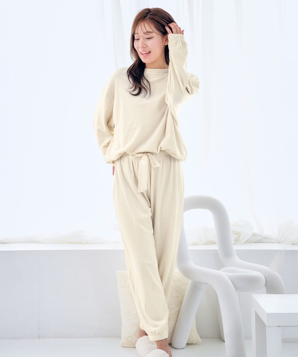 なめらかでもっちりとした肌触りが心地よいソフトボア素材で着心地バツグン!さらに裏起毛を採用しており、従来の『ストレッチ ソフトボア 長袖 上下セット(商品番号:834679)』より温かさがアップ!ゆったりとしたサイズ感で締め付けのないストレスフリーな着心地です。トップス・ボトムスの袖口はシャーリングゴム入りなので手首・足首にしっかりフィットして身体の動きを邪魔しません。ボトムスには便利なバックポケットをお付けしました。秋冬のリラックスタイムやパジャマにもピッタリな上下セットです。