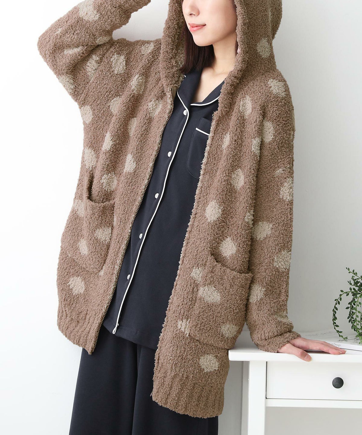 『ドットデザインでこなれ感。』ふんわり素材で癒される。あたたかくて、肌触りが気持ち良いふんわり素材のニットルームウェア。ニュアンス溢れる優しい色合いの配色ドット柄でおうち時間をお洒落に。前開きファスナーのフードデザインで顔周りもあたたかく、大人可愛い印象 スマホなどを入れるのに便利なフロントポケット付きです。肌に触れて気持ち良い、ふわふわな糸で編んだ厚みのあるドット柄ジャカードニット生地を使用。心地良い着心地で、リラックスタイムを楽しめる素材感。今、好きな物、興味あることを自由な発想で表現できる≪ n'OrLABEL ≫。「実用性と機能性、そして遊び感覚」、多面性を楽しめるピュアでモードなデザインライン。n'OrLABELドット柄ふんわりルームウェアです。 スタッフ試着データ【フリーサイズ】袖丈:手の甲真ん中位着丈:太もも真ん中より