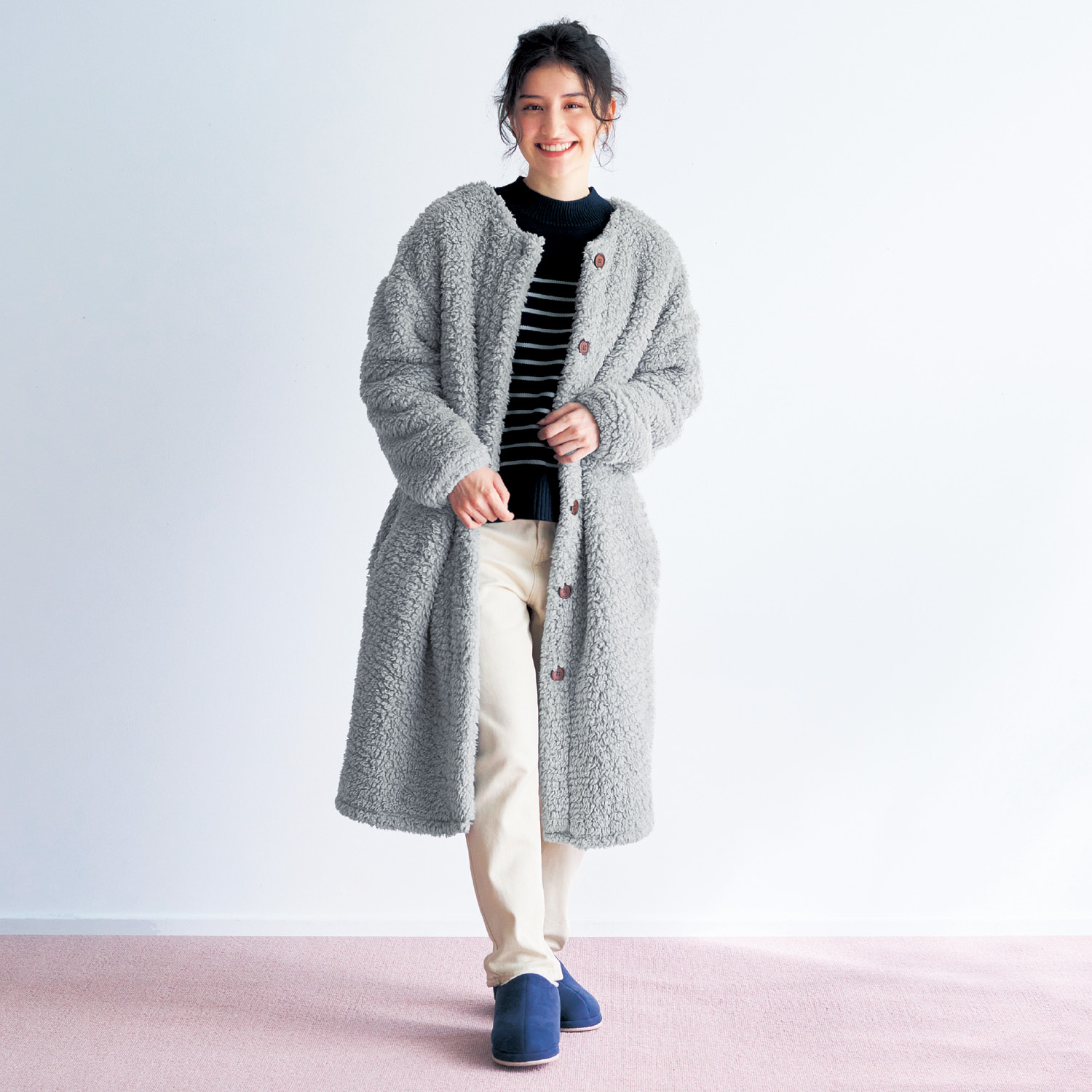 吸湿発熱性のあるシープ調ボアでぬくぬくポケットの内側までふわふわであったか袖口はゴム入りで腕まくりしやすく、家事もしやすいサッと羽織りやすい着る毛布。ノーカラーのすっきりとしたデザインなので、急な来客があっても玄関先までそのまま出られます。