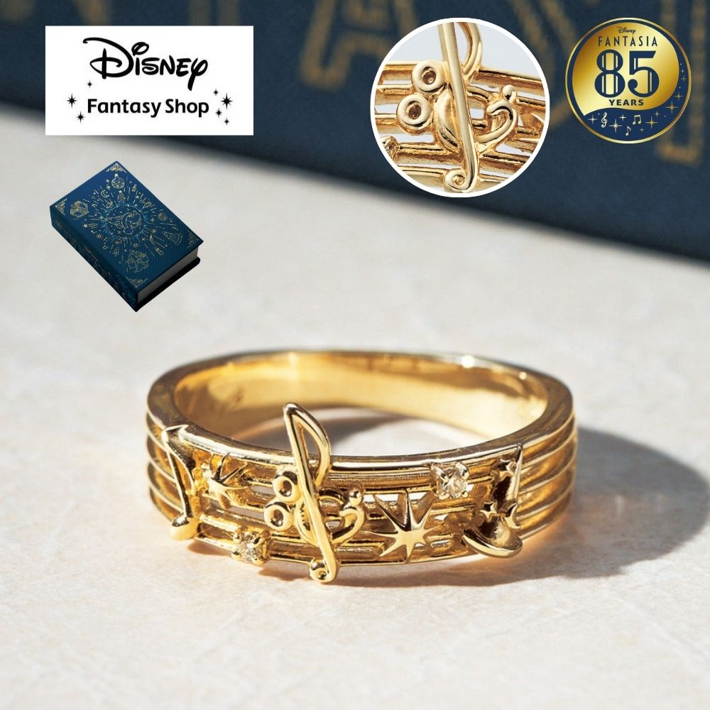 ーデザイン・スタイリングー・ディズニー映画の傑作「ファンタジア」85周年記念アイテム・受注生産で、ここだけでしか出会えないとっておきのリング・透かし仕上げの五線譜をデザインしたゴールドのリング・ミッキーモチーフのト音記号と魔法使いの帽子、音符デザインを五線譜の中にデザイン・ジャカード織りの生地を使った高級感のあるブック型ギフトボックス付き・ギフトボックスの内側にはポスターアートをデザイン・贈り物としても喜ばれそうー素材ー・高級感のある10金イエローゴールドを使用・ダイヤモンド2石の輝きで手元が華やぐ