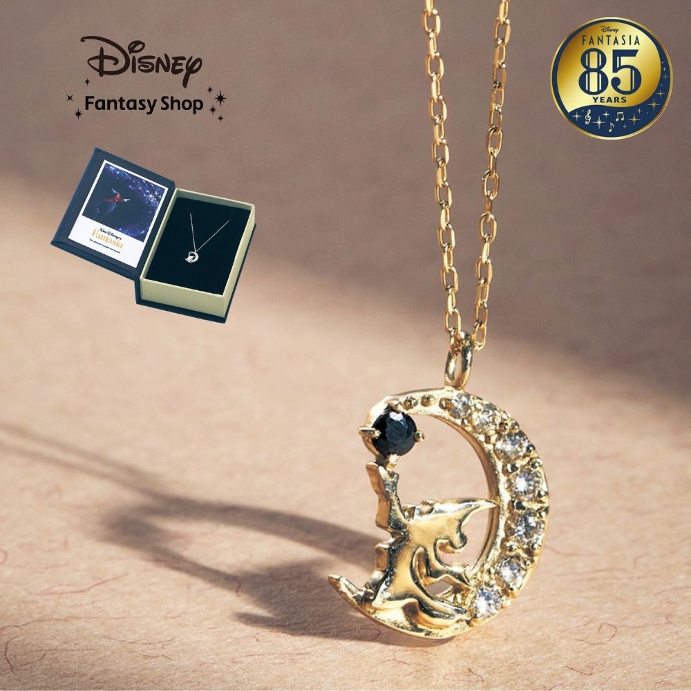 ーデザイン・スタイリングー・ディズニー映画の傑作『ファンタジア』85周年記念アイテム・受注生産でここだけでしか出会えないとっておきのネックレス・魔法使いに扮した「ミッキーマウス」がデザインに・ジャカード織りの生地を使用した高級感のあるブック型ギフトボックス付き・ギフトボックスの内側にはポスターアートをデザイン・贈り物としても喜ばれそうー素材ー・トップとチェーンは高級感のある10金イエローゴールドを使用・ダイヤモンド7石とサファイア1石の輝きでグッと華やかな印象にー機能ー・スライドチェーンでサイズ調節可能