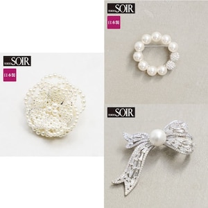 ・セレモニーにふさわしいパール調パーツをアクセントにしたブローチ。「バラ」・ベビーパールパーツを編み上げた花びらは、 ビーズのトリミングをあしらうことでより立体的で美しい仕上がりに。・クラフト感あるやさしさがあふれます。・ネックレスとの相性はもちろん◎「リング」・ストーンボールがアクセントの、サークルブローチ。・コンパクトサイズなので、フォーマルシーンだけでなく ちょっとしたお出かけにもおすすめです。「リボン」・流れるようなリボンモチーフをベースに、ストーンで輝きを添えたブローチ。・ポイントにあしらった大粒のパール調モチーフは、フォーマルにふさわしい気品あふれる佇まい。