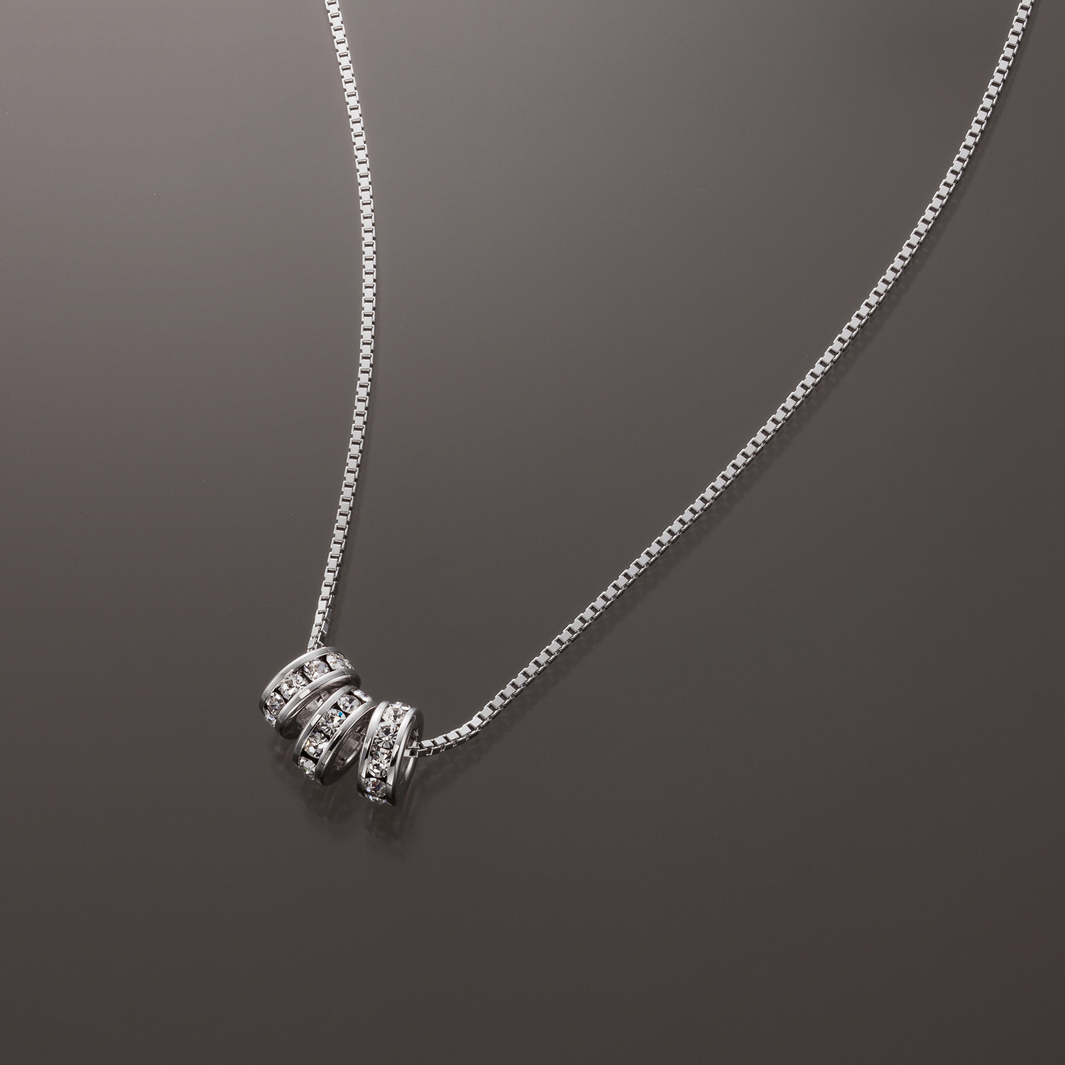 リングのモチーフにラインストーンをあしらったリングデザインが3連になったペンダント。シンプルなので、デイリー使いにもコーディネートしやすくいろいろな着こなしに重宝しそう
