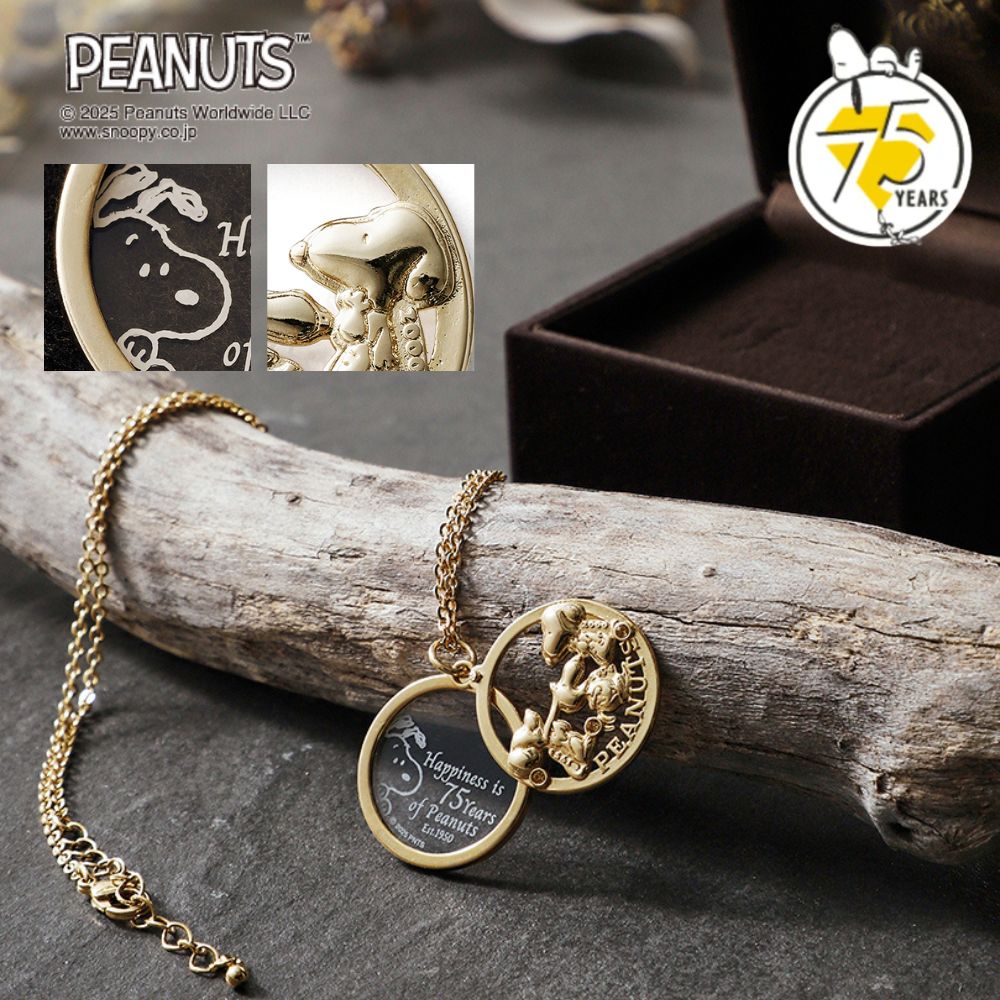ーデザイン・スタイリングー・PEANUTSコミック誕生75周年を記念したネックレス・ペンダントトップは2枚重ね仕様で、1枚目には年代別に3種類のスヌーピーをデザイン・1枚目のペンダントトップには、さりげなく3か所にラインストーン入り・2枚目のアクリル部分には、スヌーピーと75周年の英文字をプリント・薄い金色のメッキが上品で、アウターに合わせると存在感のあるアクセントに・内蓋に75周年記念を箔押しした専用ケースと共にお届け・こちらの商品は、限定200個のみの販売になります。ー機能ー・やや長めのチェーンは、留める位置で長さの微調整が可能