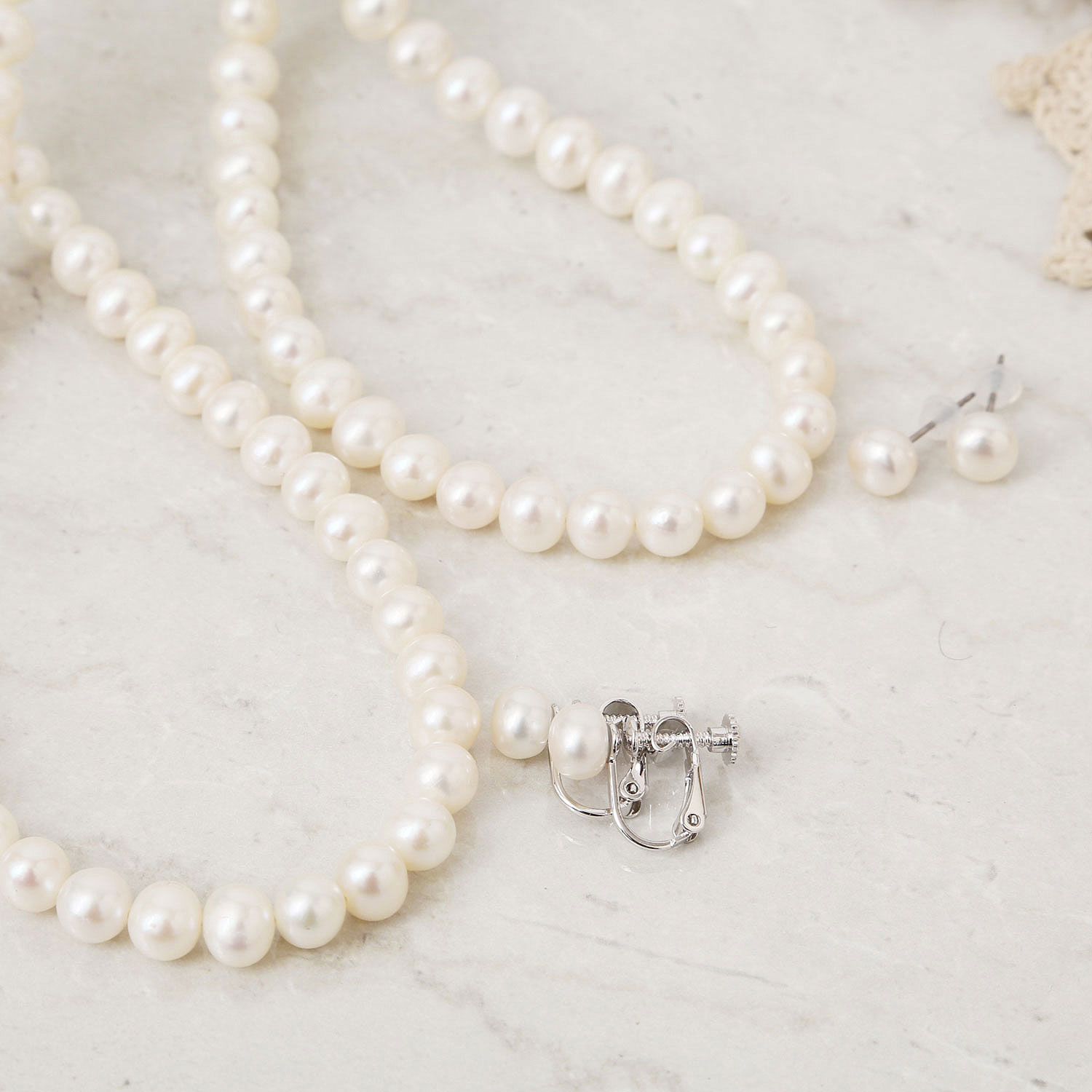 淡水パールのネックレスとイヤリング・ピアスのセット。本物のパールならではの光沢が清楚さをよりいっそう引き立ててくれます。様々なシーンで活躍する定番アイテムなので長くご愛用いただけそう。