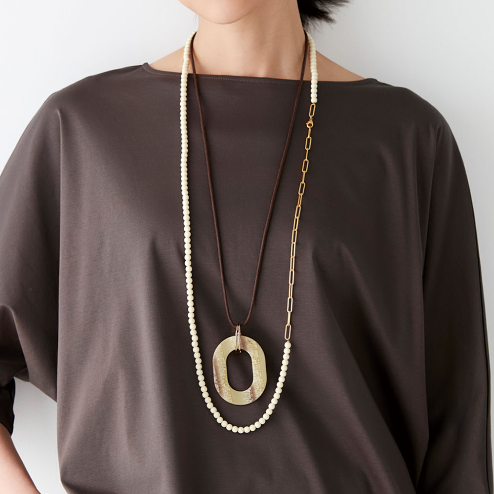 なんと約9.5~24.5g。軽さにこだわったネックレススポッとかぶるだけで着脱OK!長さ調節が簡単にできて、いろんな服に合わせやすいひとつでも、重ねづけでもコーデに映える「ネックレスを着けたいけど重いのは苦手...」という方におすすめの、軽さにこだわったロングネックレス。ネック部分をコードにしたり、パーツにはできるだけ軽い素材を使うなど、大人の女性がラクに着けられるよう仕上げました。スポッとかぶるだけで着脱できて、長さ調節も簡単だから、忙しい朝もいろんな服にサッと合わせられます。ひとつで着けたり、重ねづけでいろんな組み合わせを楽しんだり、毎日のコーディネートに活躍させて。