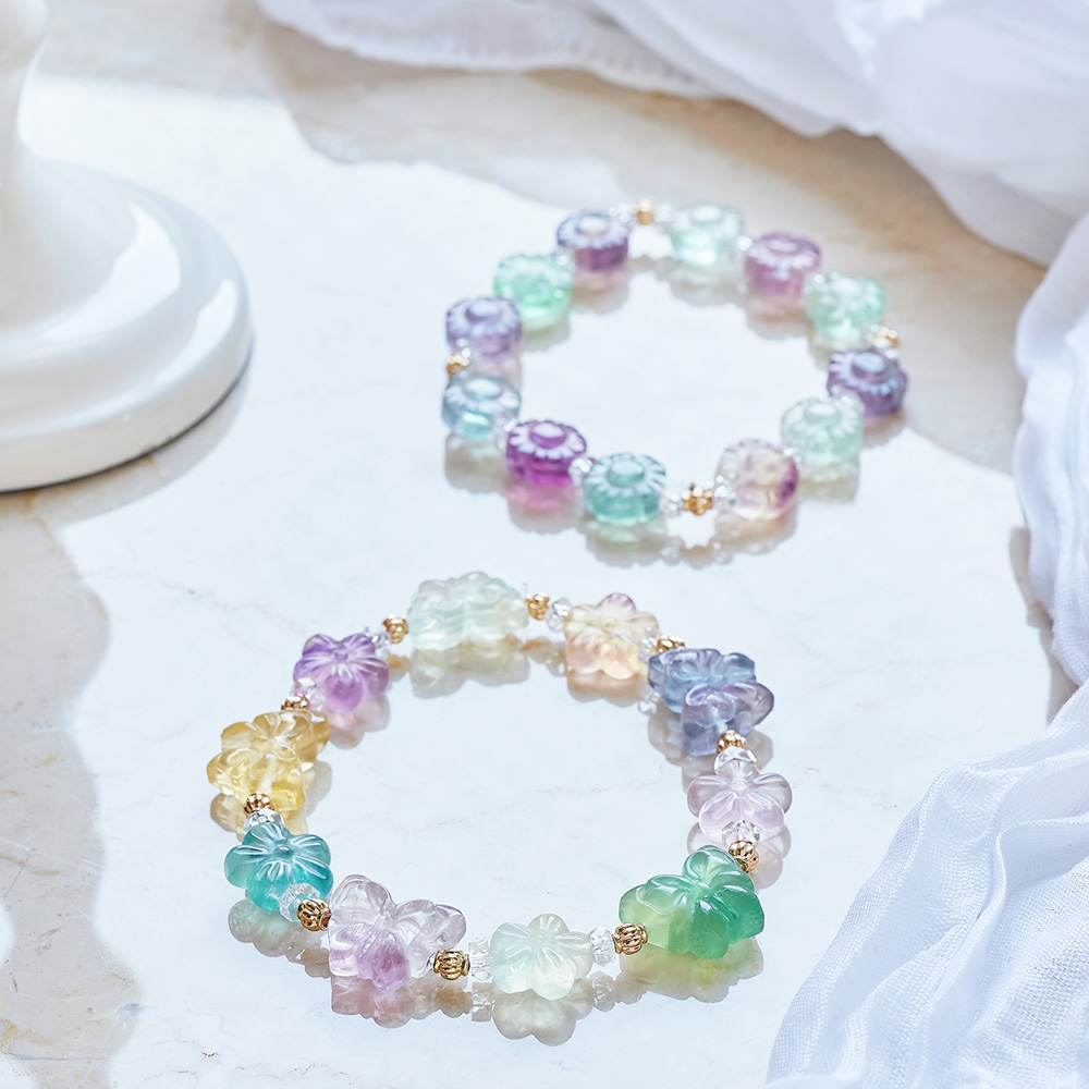 フローライトは、ブルー、グリーン、パープル、イエローなどさまざまな色合いの宝石です。紫外線を当てると蛍光色に発色することから和名では「蛍石」と呼ばれており、「天才の石」や「知性の石」といった意味があります。この石を持つと思考を引き出し、発想力・記憶力・集中力を高める効果が期待できるとされています。ブレスレットはゴム仕様でどなたでも簡単着脱。単品使いはもちろんのこと、2点のコーディネート使用もおすすめです。エレガントでおしゃれなデザインでプレゼントとしても喜ばれること間違いなし。