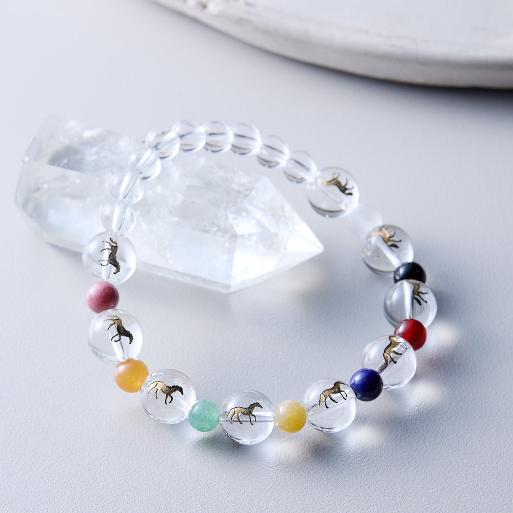 古くから九頭の馬が揃った「九頭馬」は躍進の兆しを告げるといわれ、『万事が馬九行(うまくい)く』と尊ばれています。縁起の良いといわれる水晶の大玉に九頭の金の馬像を施し、枠をイメージした8種類の天然石をあしらったブレスレットです。8種類の天然石が様々なパワーを発揮して、あなたに幸運を招いてくれる事でしょう。このブレスレットが、きっとあなたの人生をうまくいかせてくれるはずです。フロスト水晶(白)..潜在能力アップ ブラックオニキス(黒)..邪念を取り払う赤メノウ(赤)..健康と長寿ラピスラズリ(青)..幸福招来イエローオニキス(黄)..金運アップアベンチュリン(緑)..若さを保つパワーオレンジアベンチュリン(橙)..家庭円満バラキセキ(桃)..エネルギー回復
