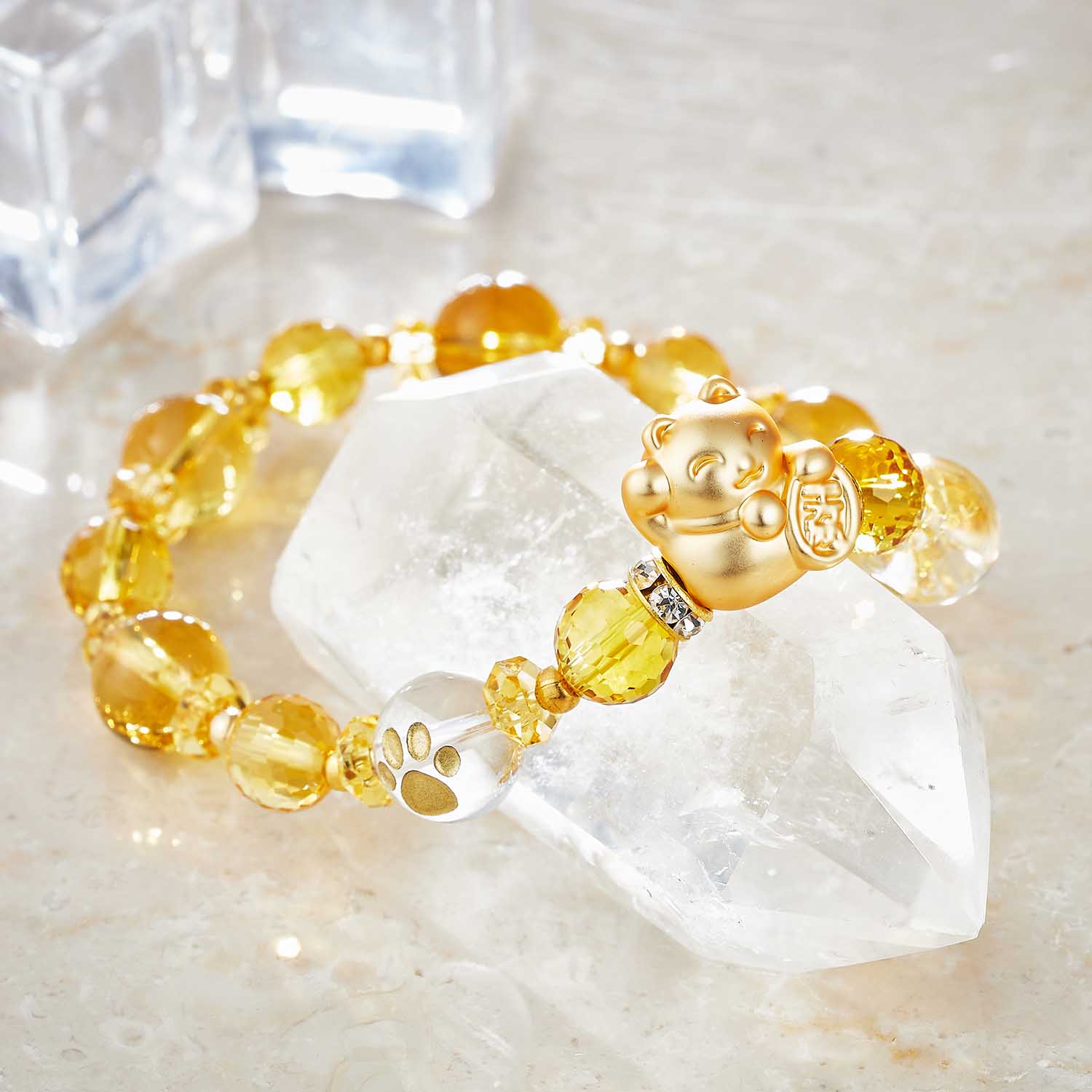 風水で黄色や金色は金運を呼び込むとされる色です。黄色いものを身に着けていると財運を授かり、一生お金に困らず幸せに暮らせるとされています。招き猫は人、財を招き、良い運を引き寄せて悪運を払ってくれる、幸運を運ぶとされ、右手を挙げている猫はお金や商売繁盛を招く意味があり、黄水晶と招き猫のパワーでさらなる金運を招いてくれる事でしょう。