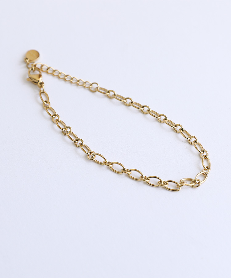 デザイン316Lステンレス加工で金属アレルギーに対応しているチェーンブレスレット。シンプルなのでスタイリングに取り入れやすく、手元からお洒落な印象に仕立てます。 コーディネートどんなテイストにも馴染むデザイン。シンプルなコーディネートにプラスするだけで洗練されたスタイルに導きます。 素材316Lステンレス鋼は、通常のステンレス材よりもサビに強く腐食しにくい特性をもったハイグレードの極低炭素合金素材です。金属アレルギー反応が起きにくいことから、人体に直接触れる医療器具や時計バンド等に広く用いられています。PVDコーティングメッキを施すことにより、一般的なメッキよりも密着性・耐食性・耐摩耗性に優れており、鮮やかな発色を維持し、長い期間アクセサリーを楽しんでいただけます。 全ての方のアレルギーに対応するということではありません。アレルギー症状が見られる場合は直ちに着用を中止し、医師に相談してください。過度の力を加えますと破損の原因になりますのでご注意ください。付ける位置により