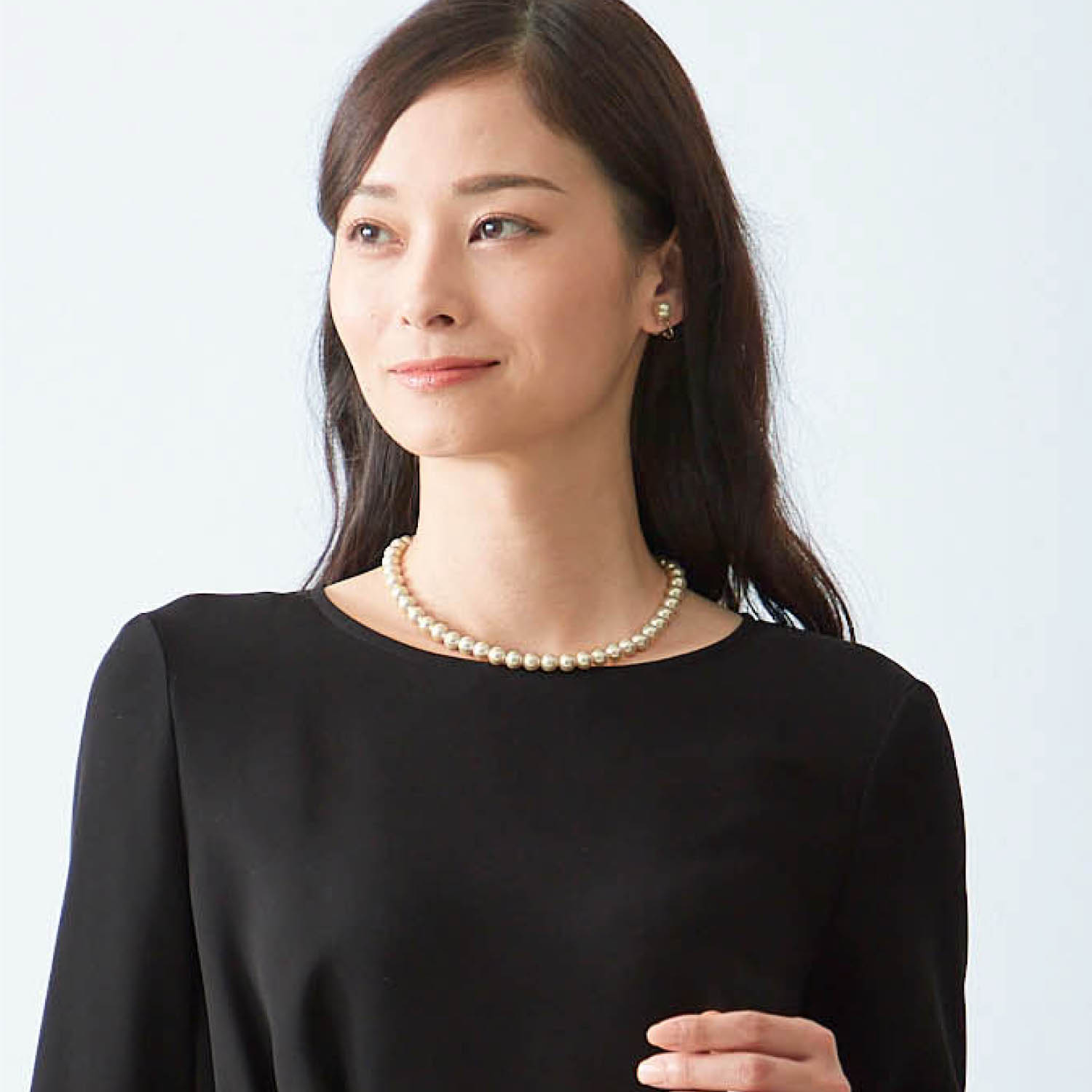 ―デザイン・スタイリング―・8mmで揃えられたパーツは、首元に自然と沿うようなフォルムを演出・落ち着いたカラーで、飽きがこず、どんなフォーマルウェアにも似合う・オーソドックスなデザインなので、大人カジュアルコーディネートでも活躍―素材―・重厚感のある貝パールなので、照り感が美しくしっかりとした質感・貝パールは天然パールよりキズや汗にも強く、扱いやすいのも魅力―機能―・共通の貝パールを使った8mm珠のイヤリング付き・クラスプ部分は、花をかたどった愛らしいデザイン