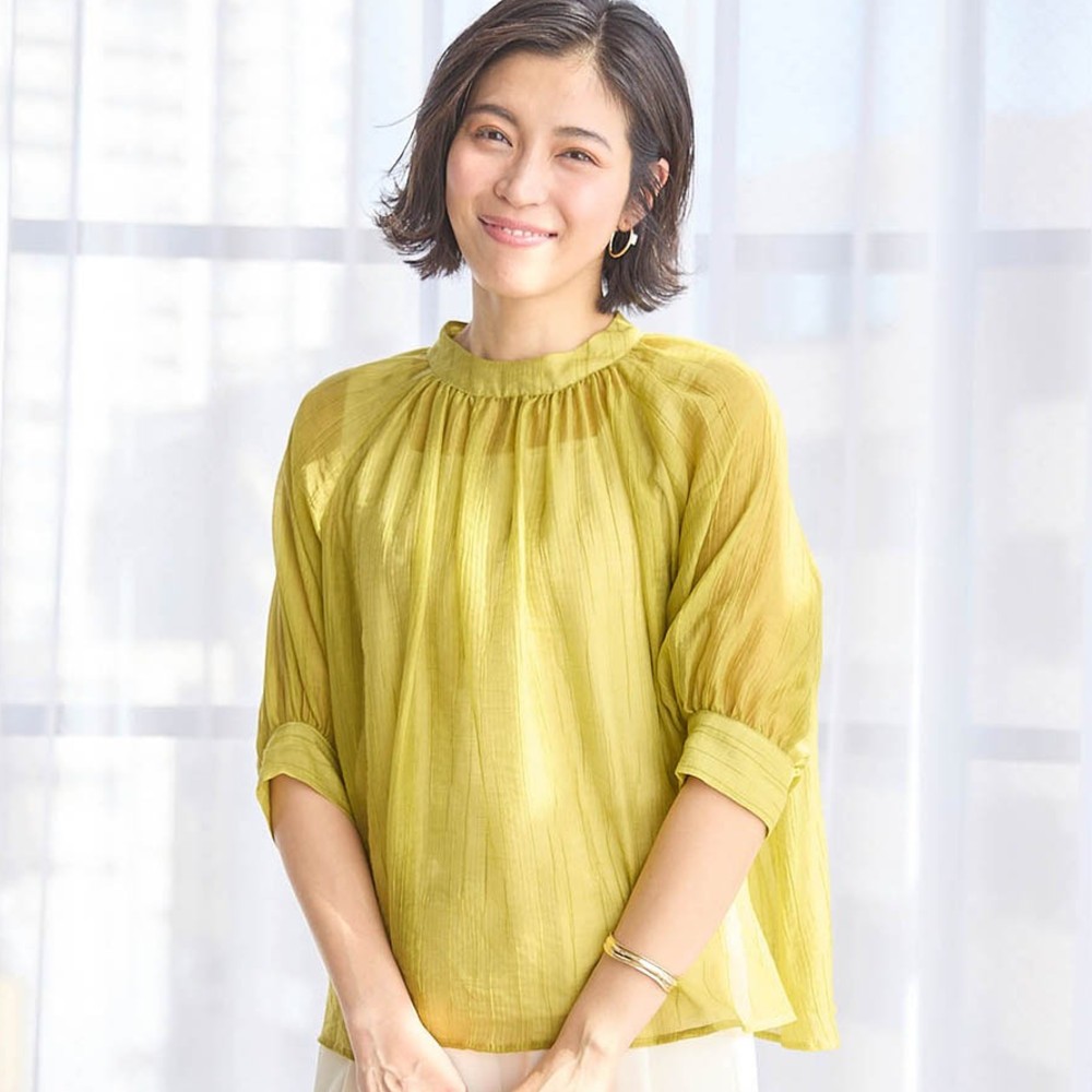 ―デザイン・スタイリング―・肘まですっぽりカバーするギャザー袖は、安心感と華やぎを両立・ほんのり立ち上がるネックラインと長めのカフスで きちんとした印象に・後ろ開きのゴールド調ボタンも上品―素材―・シボ感のあるシアー素材で表情豊かにStyle Note(スタイルノート)2000年のデビュー以来、長きにわたりご好評を頂いている ベルメゾンのオリジナルブランド。トレンドを適度に取り入れながら、素材・仕立て・シルエットに至るまで、大人の女性にふさわしいクオリティを追求し、お洒落が楽しくなるスタイルをお届けします。