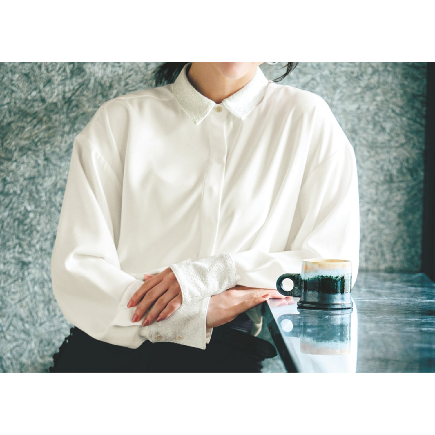 ―デザイン・スタイリング―・襟やカフスにさり気なくレースがあしらわれた、エレガントなシャツ・身幅や袖はゆったりとしたサイジングに・窮屈感なく、重ね着にも重宝―素材―・身生地は上品な質感のジョーゼット素材Style Note(スタイルノート)2000年のデビュー以来、長きにわたりご好評を頂いている ベルメゾンのオリジナルブランド。トレンドを適度に取り入れながら、素材・仕立て・シルエットに至るまで、大人の女性にふさわしいクオリティを追求し、お洒落が楽しくなるスタイルをお届けします。