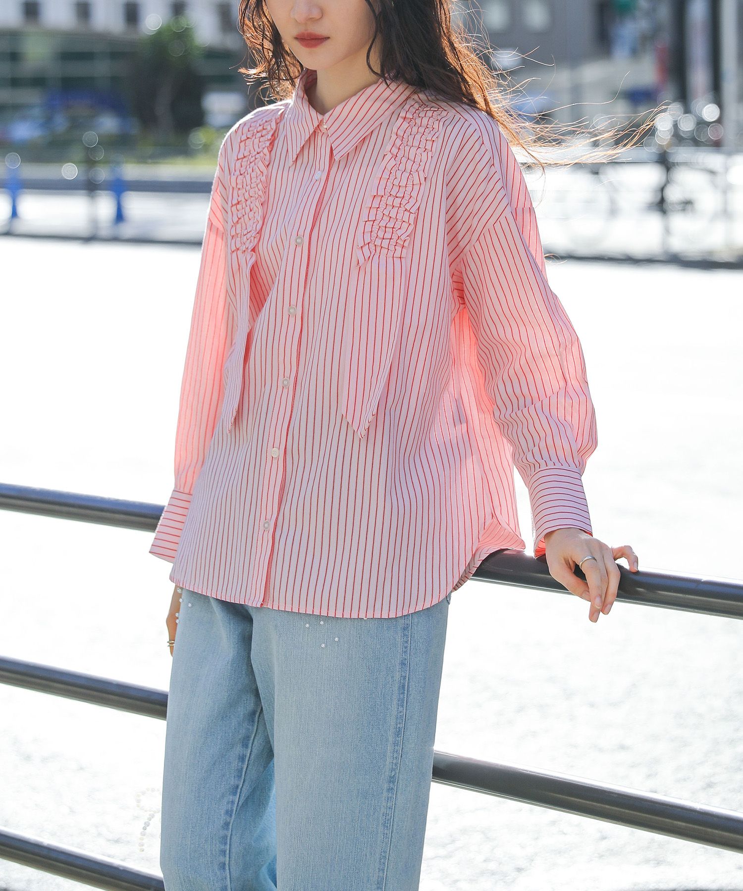 デザインフロントにあしらったフリルのようなギャザーモチーフが印象的なストライプシャツ。ゆるっとラフに着用できるドロップショルダーのシルエットで、甘くなりすぎず気軽に毎日のスタイリングに取り入れていただけるデザインです。少しフレアになったカフスが上品な女性らしさをプラス。脇はカーブラインになっており、インでもアウトでもすっきりとご着用いただけます。 コーディネートパンツ合わせで程良く甘さを演出する着こなしがおすすめです。デニムと合わせたカジュアルな着こなしでデイリー使いにもぴったり。きっちりし過ぎずデニムが程よい外しアイテムになってくれます。チュールスカートなどに合わせるとシャツのきちんと感で幼くならず、上品にコーディネートしていただけます。 素材さらりとした肌触りのストライプ柄ドビー生地。軽やかな着心地で、合わせるアイテムによってロングシーズンに着回してい