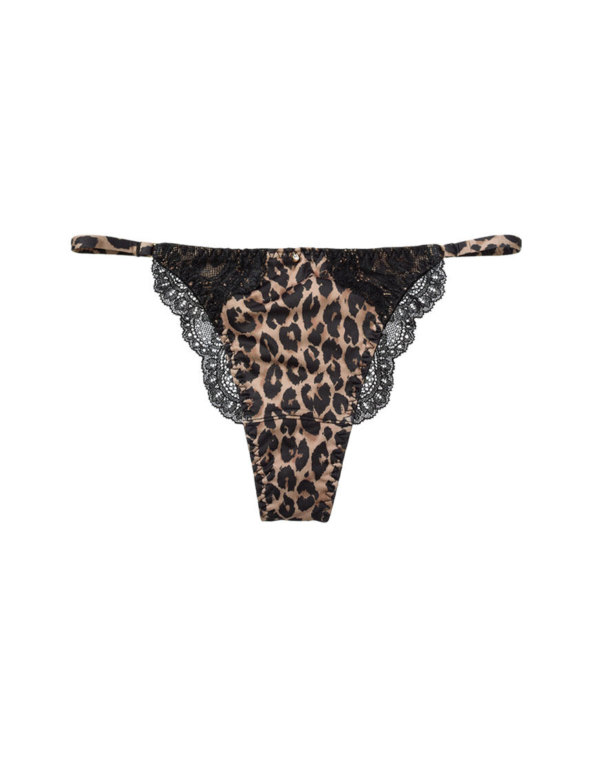 【フロント】・身生地はプリント柄のストレッチ生地。上部左右にストレッチレースを重ねて、プリントが透けて見えるデザイン・脚ぐりにストレッチレースをあしらって華やかさアップ・サイドストリングは、平ゴムをプリント生地でくるんだ仕様で肌あたりソフト・センターに、ゴールド台座のラインストーンチャームが輝く【バック】・ストレッチレース1枚仕立てで、圧迫感が少なくやさしいフィット感・サイドストリングとレースのジョイント部にゴールドカラーのリングを使い、さりげなく高級感をプラス【はき込み】・ローライズ(浅め)【クロッチ】・表側はプリントストレッチ生地・肌側はコットン