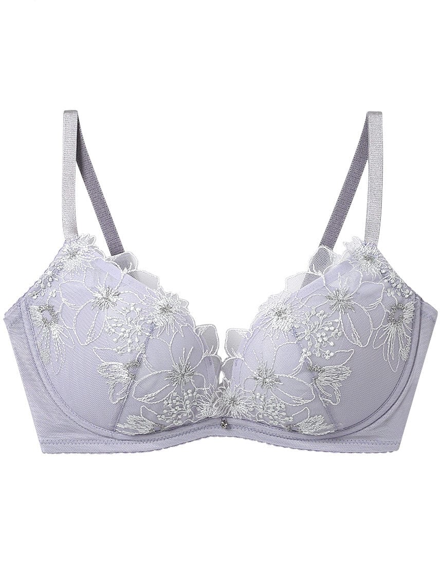 【おすすめポイント】・ダイエットしないでスレンダーに見せる!「見た目体重オフ」機能で人気のシリーズ。・バストを内側へプッシュすることでボディのサイドに影を作る、スマートシャドウ効果で劇的に着やせ。・脇高のサイドベルトで脇や背中のぷよ肉をカバーし、サイドのシルエットを整えるスマートライン効果ですっきり見せ。・表面が比較的フラットなレースを使用。薄手のトップスにも凹凸がひびきにくい。【こんな人、こんな時に】・上半身がもったりして見える・バストの横広がりが気になる・ビッグシルエットやニットなど、太って見えやすい服をほっそりと着こなしたい・華やかな総レースのランジェリーが好き【バストメイク・機能】・カップは脇側のふくらみを削り、補強パネルを内蔵した設計。余分な丸みを押さえてサイドすっきり、スレンダーに見せる。・無理なく内向きに寄せ上げて、乳間狭め・トップ位置高めのバストラインをメイク。・柔らかな「ソフトタッチワイヤー」を肌に当たらないようカップの外側に配置。軽いフィット感で毎日ラクに着けられる。・カップ周りのパネルにクッション性のあるウレタンシート入りで、やさしくフィット。・柔らかく弾力のある下厚モールドカップ。カップの厚みはサイズにより異なり、最適なボリュームをプラス。B、 C 65〜75、D65・70、E65:厚めC80、D75・80、E70〜80、F:薄め・カップ肌側はソフトなピーチスキン生地。・脇高のサイドベルトは、ストレッチレースとパワーネットの二重。ボーンはなく、テープのみ。・ストラップがズリ落ちにくいUバック仕様。【デザイン】・大ぶりで洗練された花柄のストレッチレースを全体に使用・服にひびきにくいアンダーバスト付近に、タック入りのレースをあしらって上品なポイント・センターにスクエア型のラインストーンチャームが輝き、大人っぽいアクセント【やせずにブラで、見た目体重オフ! -スマートブラ- 】今よりスリムになりたいけれど、我慢や努力はちょっと…。そんなワガママをブラが解決!小顔メイクのシェーディングと同じように、ボディのサイドに影を作ることで劇的な着やせ効果。トップ位置もぐっと引き上げるので、ウエストまで細く映えます。体形をすっきり、シャープに見せたい方に。