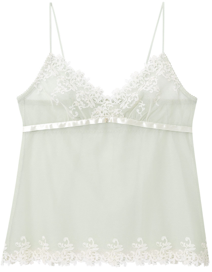 ケミカルスカラップのエンブロイダリーレースの下にラメチュールをしのばせたグループ。ラメ糸のエッセンスと繊細なステッチングでいつもより華やかな日常を演出します。●カップと裾部分にエンブロイダリーレースをほどこした贅沢な印象のキャミソール。●身頃はチュールを重ね、軽さを演出しています。●前中心にラインストーンのチャーム付。