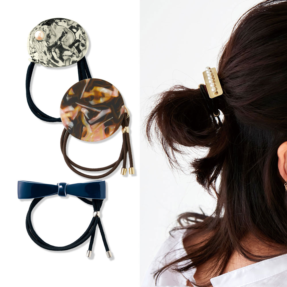 金属、樹脂、モチーフなど多彩なデザインが楽しめるアジャスターでゴムの長さを変えてブレスレット使いもモチーフ部分平均約4~5cmと上品なサイズ感ヘアゴムでまとめた髪の上から重ね着けするだけで、おしゃれ度をUPしてくれるアクセサリー。ゴムは長さ調節OKだから、差し色が欲しい時や、お手持ちにアクセサリーと重ね付けするなどブレスレットとしてコーディネイトも楽しめます。プレゼントにも使える可愛いパッケージでお届け。※累計販売数は2011年12月以降~23年6月14日時点
