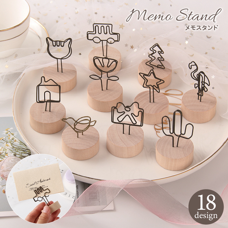 ■メモスタンド メモクリップ カードホルダー カード立て 写真 小物 雑貨 インテリア 文房具 文具 卓上 木製 花 星 ネコ 猫