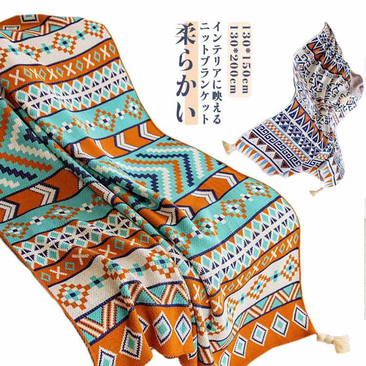 ■膝掛け 大判 フリンジ付きニットブランケット 大判ブランケット 総柄 柔らかい ブランケット 北欧 ひざ掛け おしゃれ 毛布 エスニック風
