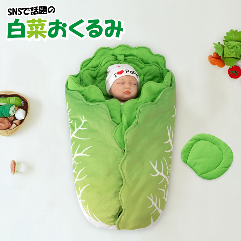 白菜モチーフのベビー用おくるみです。 出産祝いやギフトにオススメです! おくるみとしてだけでなく、お出かけ時の日よけや、ブランケットにもお使い頂けます。 【材質】 ポリエステル 【サイズ】 約70×40cm ※モニターの設定や環境により、画像と色味が異なる場合がございます。 ※説明書がある場合は外国語となります。 ※配送または仕入状況により商品の箱に凹み、スレ等がある場合がございます。パッケージ不良による交換返品は対応出来かねますので、ご了承をお願いします。