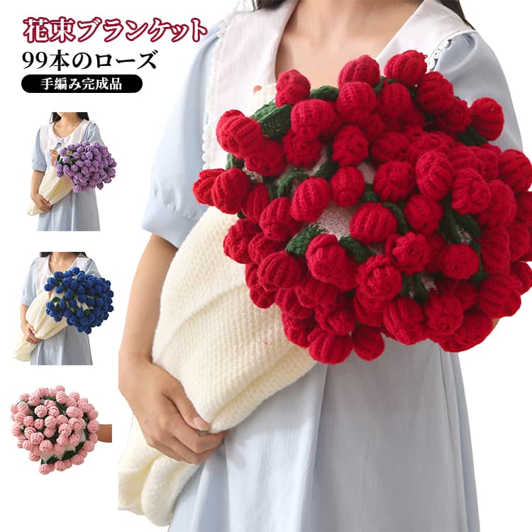 ■完成品 花束ブランケット 99本のローズ インテリア ひざ掛け バラ 手編み ブランケット 大判 おしゃれ 軽量 ブーケブランケット 毛布 撮