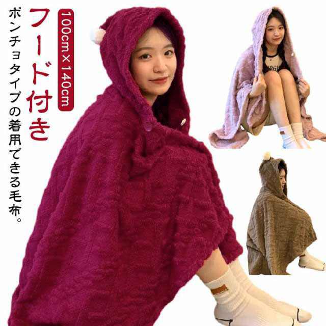 ■大判 ブランケット 着る毛布 肩掛け 毛布 フード付き 掛け毛布 ボア もこもこ ふわふわ 暖かい ショール ストール ポンチョ ボタン付き